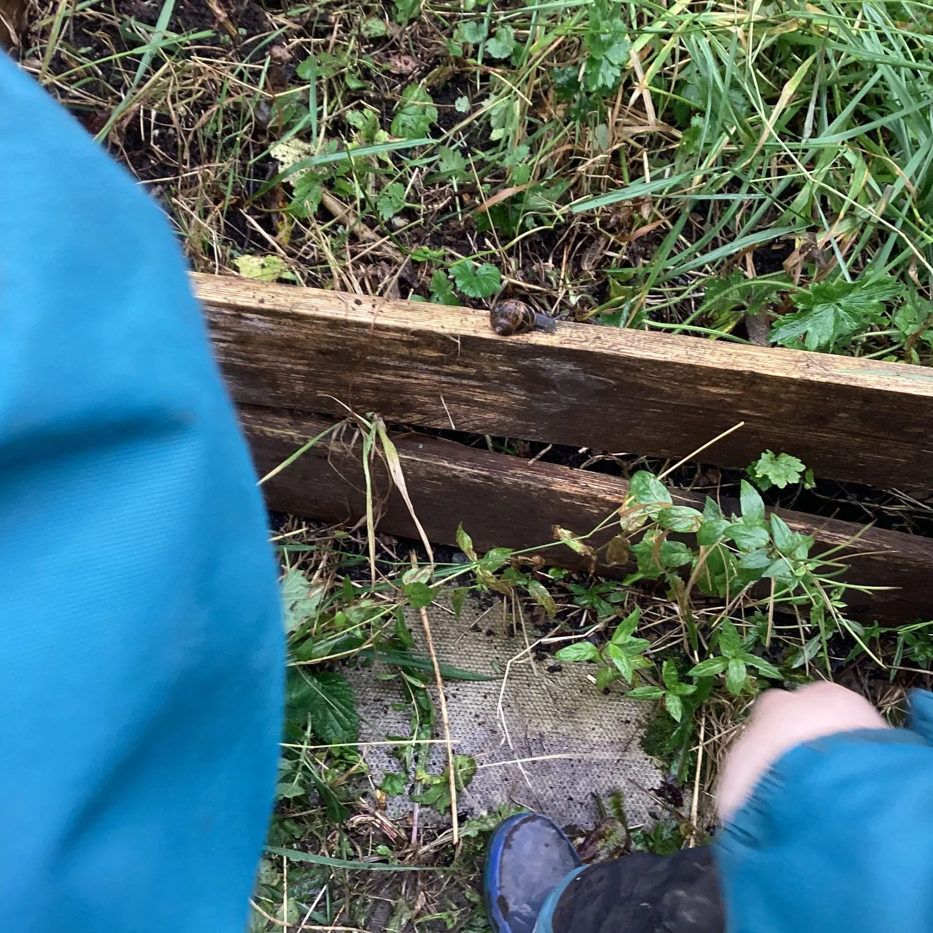 We arrived at the allotment today and it was wet and rainy but that did not stop us! We looked closely at the pond to see if the tadpoles had grown. The children pointed them out as they were everywhere and looked much bigger than last week. The plants are beginning to flourish and we could see movement in the pond. We wonder what we might see next week!
