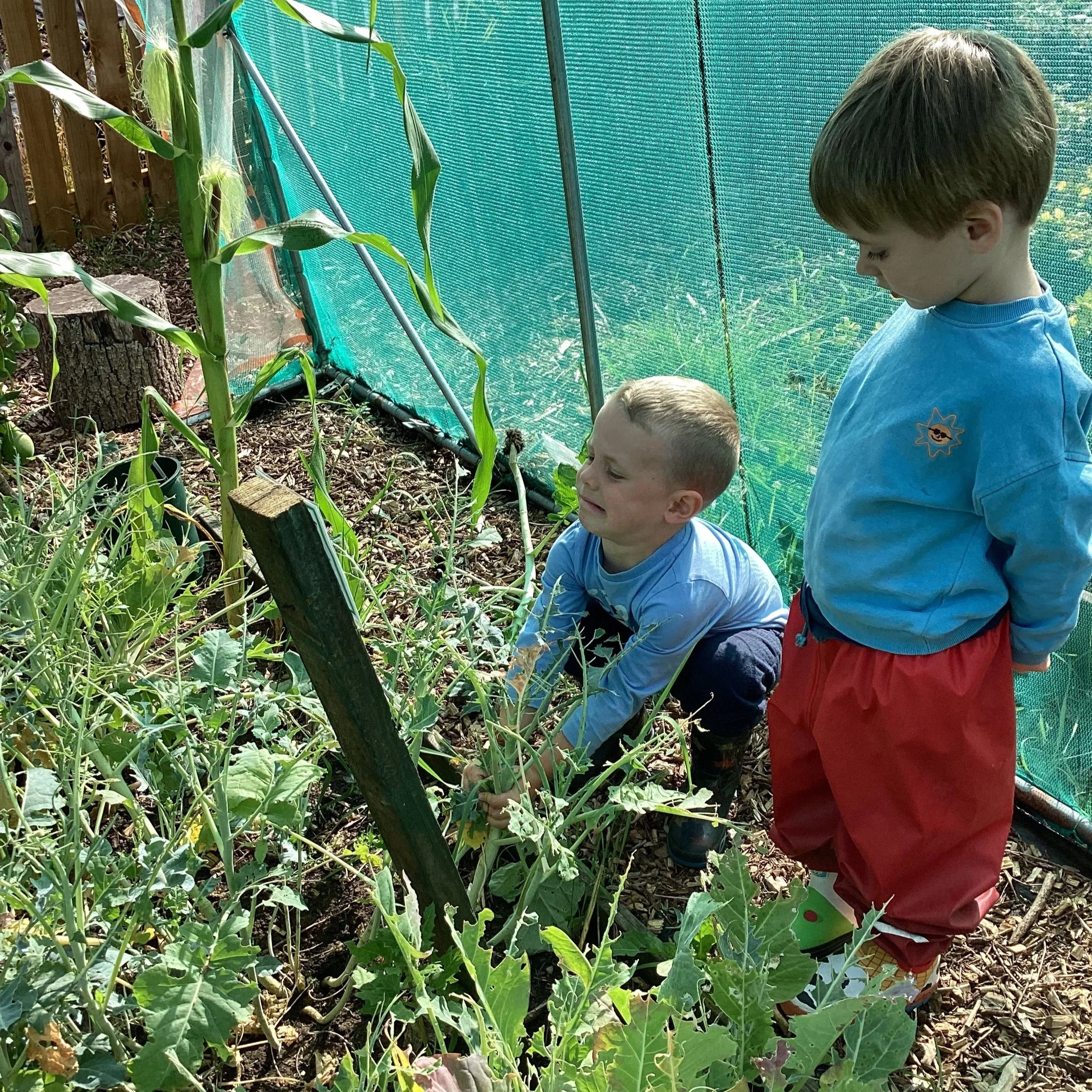 This week, the children had a great time at the allotment harvesting the last of their produce. We were excited to see that our sweetcorn were eventually ready. We took it in turns to pick them, twisting and pulling them off the plant. We then discarded the rest of the plant into the compost bin. We checked on our pumpkins and they were looking very good. There was one big orange pumpkin but the others were green. As their vine had snapped, we made the decision to take them back to nursery and see if they would change colour there.