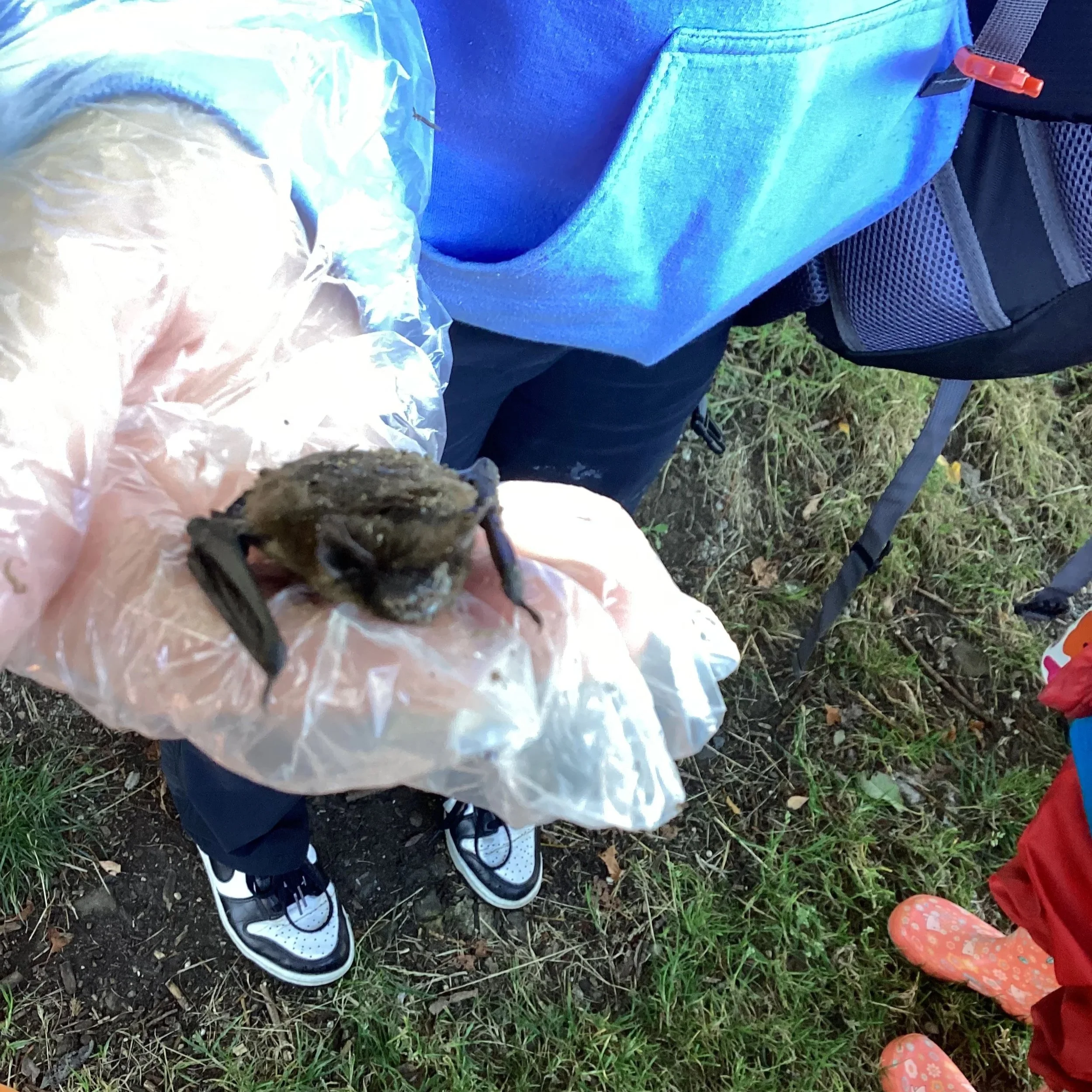 As we arrived on the allotment we were sad to find a bat lying on the ground. The bat was ‘not moving’ and the children became very worried when they spotted a cat nearby. We decided to move the bat into the safety of our allotment. One of our grown-ups put on a glove so she could safely move the bat and we placed it in a dark corner but not before the children had taken a look. Many had never seen a bat so close up before.