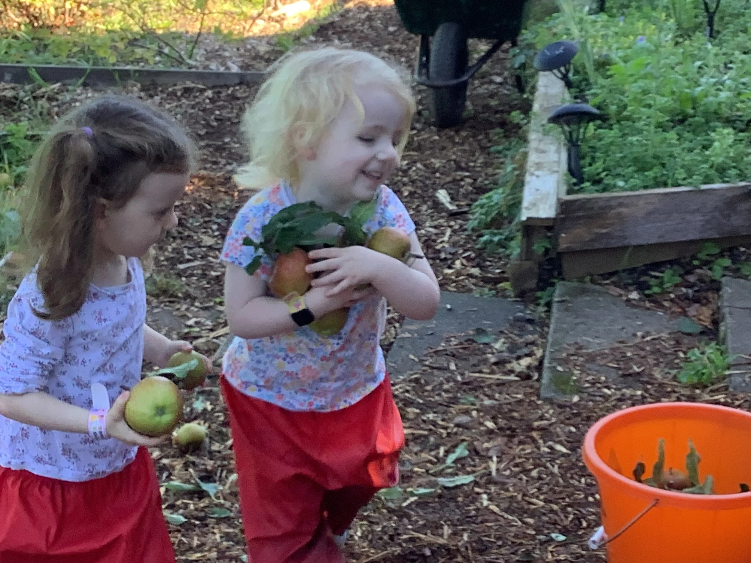There were lots more apples to harvest so we gave our tree a big shake and quickly filled our buckets. Before we took them back to nursery we needed to engage in the ‘taste test’. We cleaned the apples before taking a bite. They were some of the best tasting apples we had ever had! The thumbs up are to show just how amazing they were.