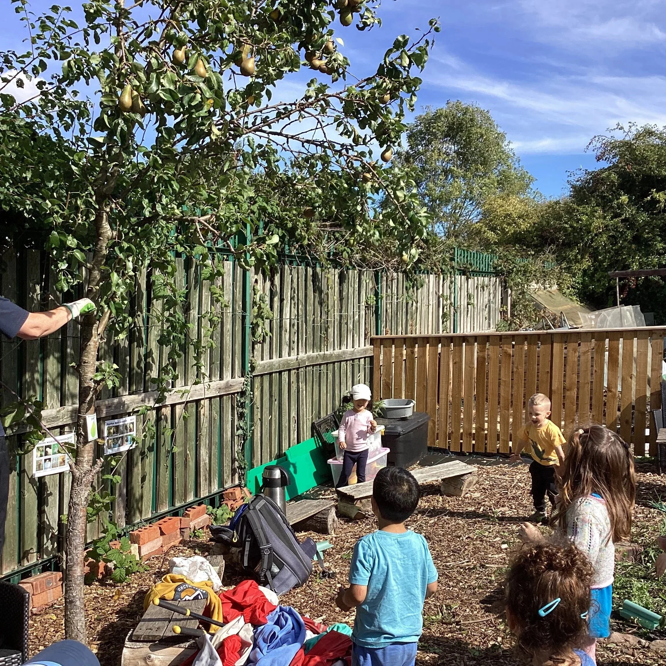 This week, we took a new group of children to the allotment, some of which had never seen our allotment before. We headed off in the minibus which is one of our favourite parts of the day as we spot different colour cars, bridges, shops and places we visit with our family. We often hear, “Look, there’s Morrisons. I go there with my Mummy and Daddy!”. We walked into our allotment and the children were immediately amazed by the amount of apples on our apple tree. We even had to duck our heads underneath it to get past!