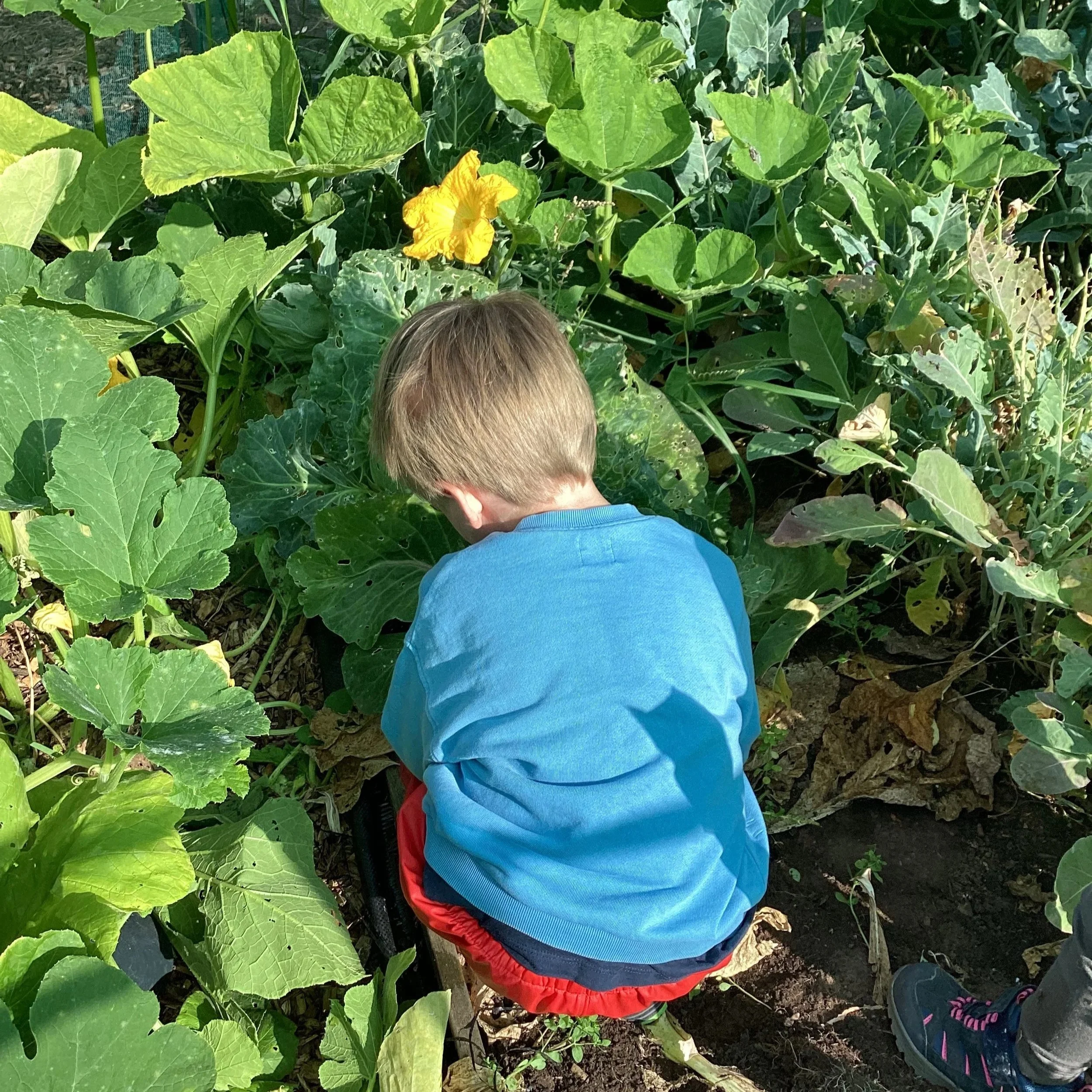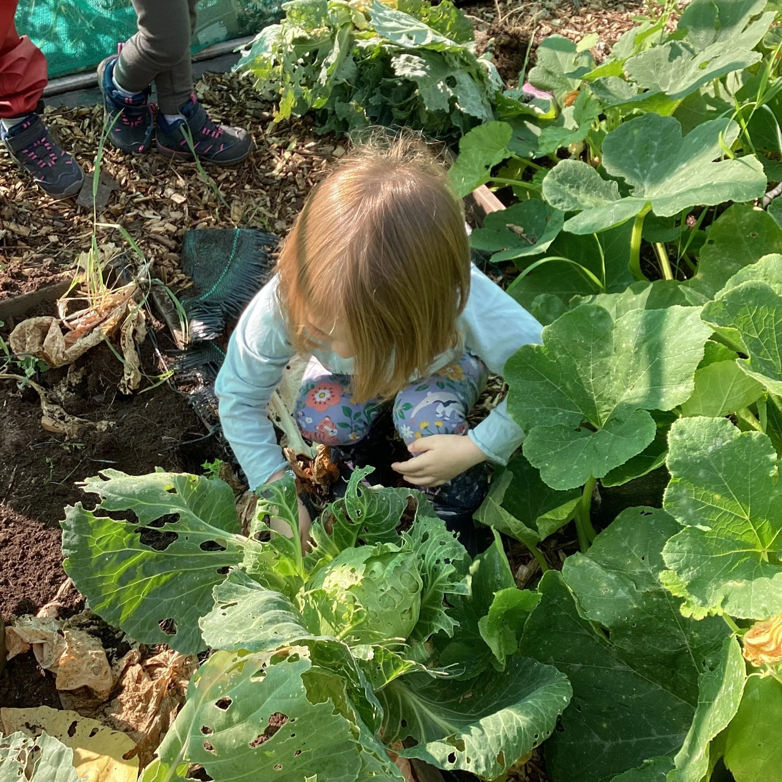 We worked on some our growing beds today and found more onions and potatoes which we had left behind. The children added these our buckets to bring back to nursery. We engaged in a little bit of weeding and we checked on our wonderful pumpkins (you may be able to see them in the background of the photo with the fruit cage). These will come in very handy around Halloween.