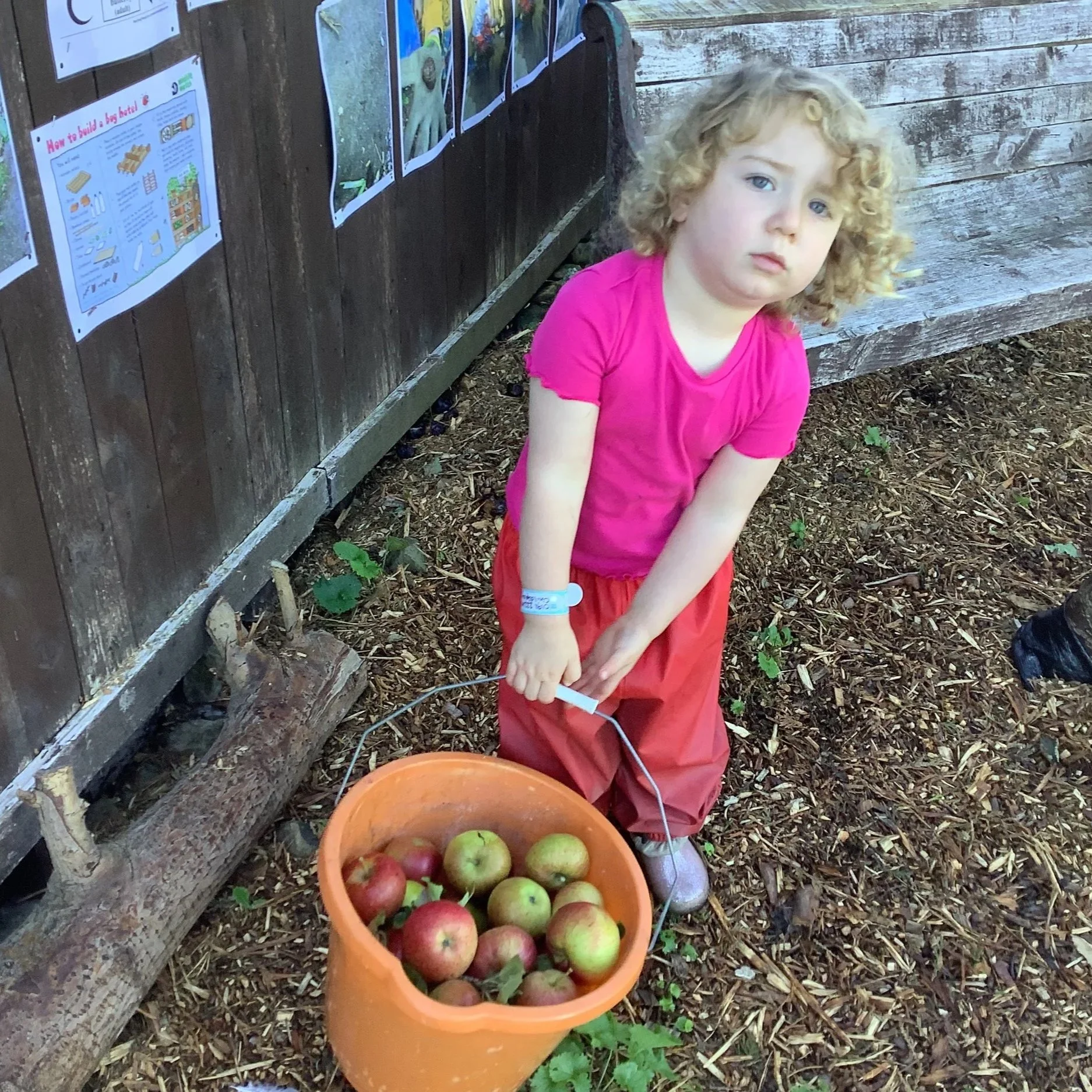 One of this weeks jobs was to chop up all the branches we cut down last week and create fire wood for our forest schoolers. The children were amazing at removing leaves from the branches before we cut them up using our loppers. We also realised that we have many, many apples, plums and pears which were ready to eat. One of our grown-ups shook the trees and all the fruit fell down onto the ground. The children collected it and placed it into our big orange buckets. We then counted out the apples and placed them into bags to sell in our nursery shop. It looks like there may be lots of apple crumbles being made tonight!