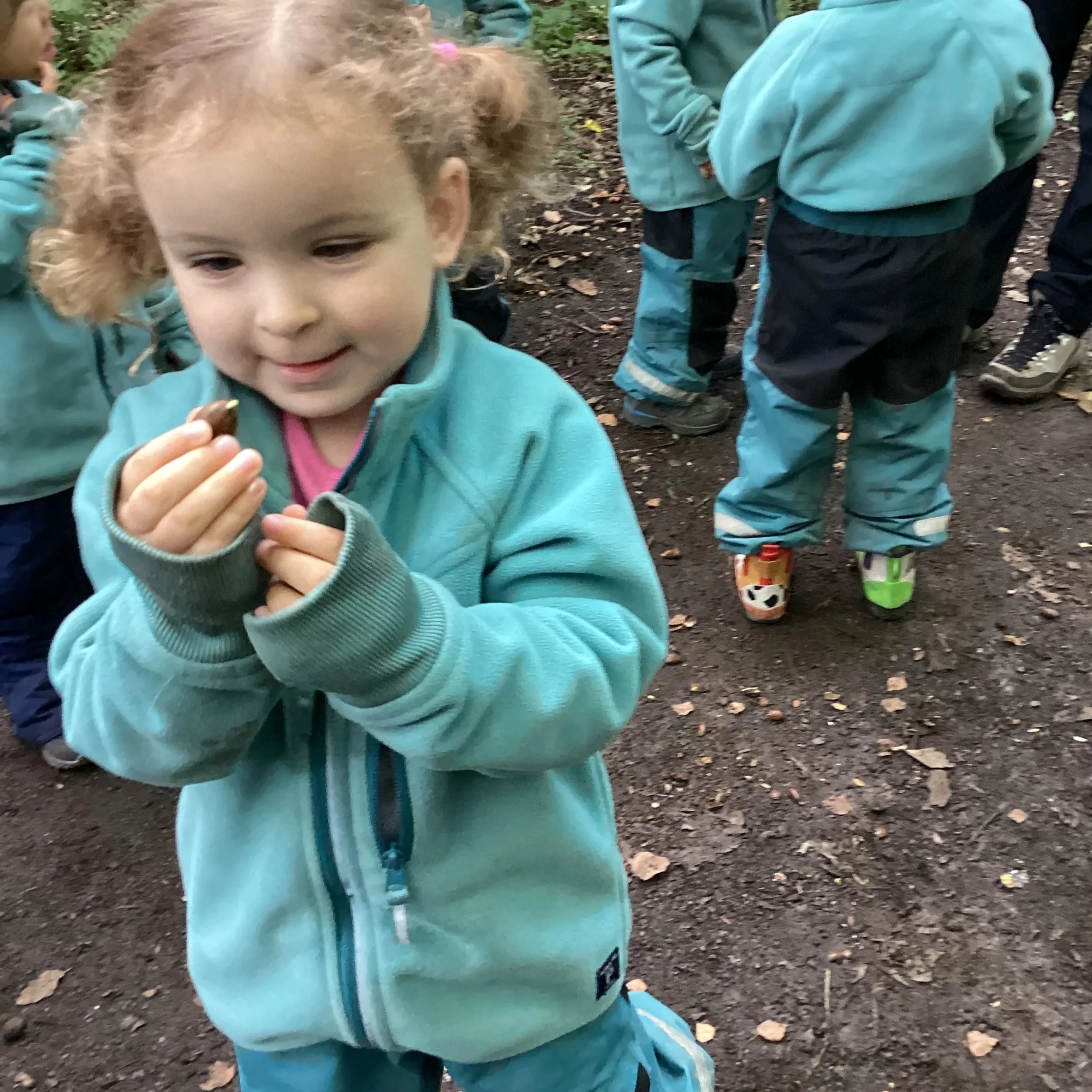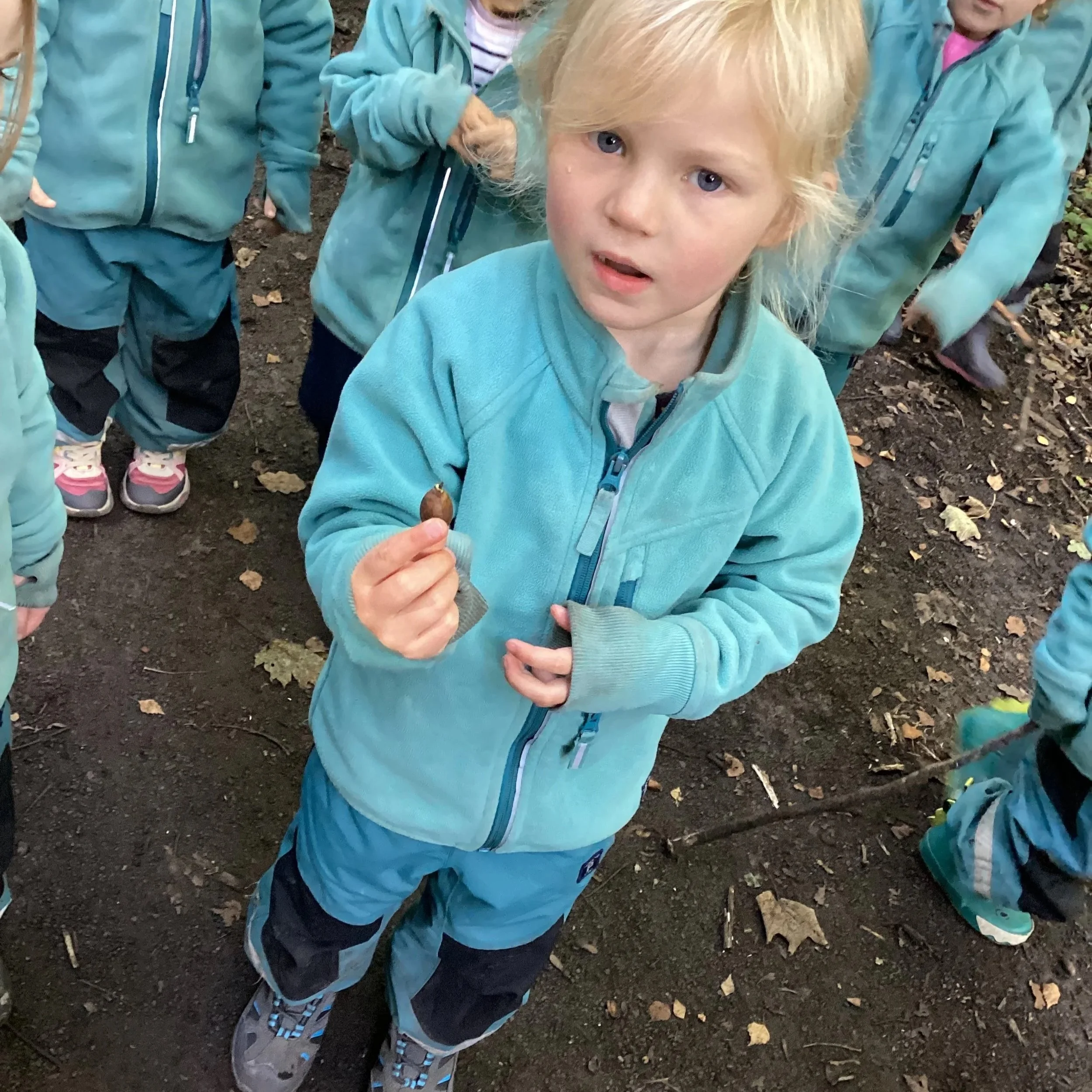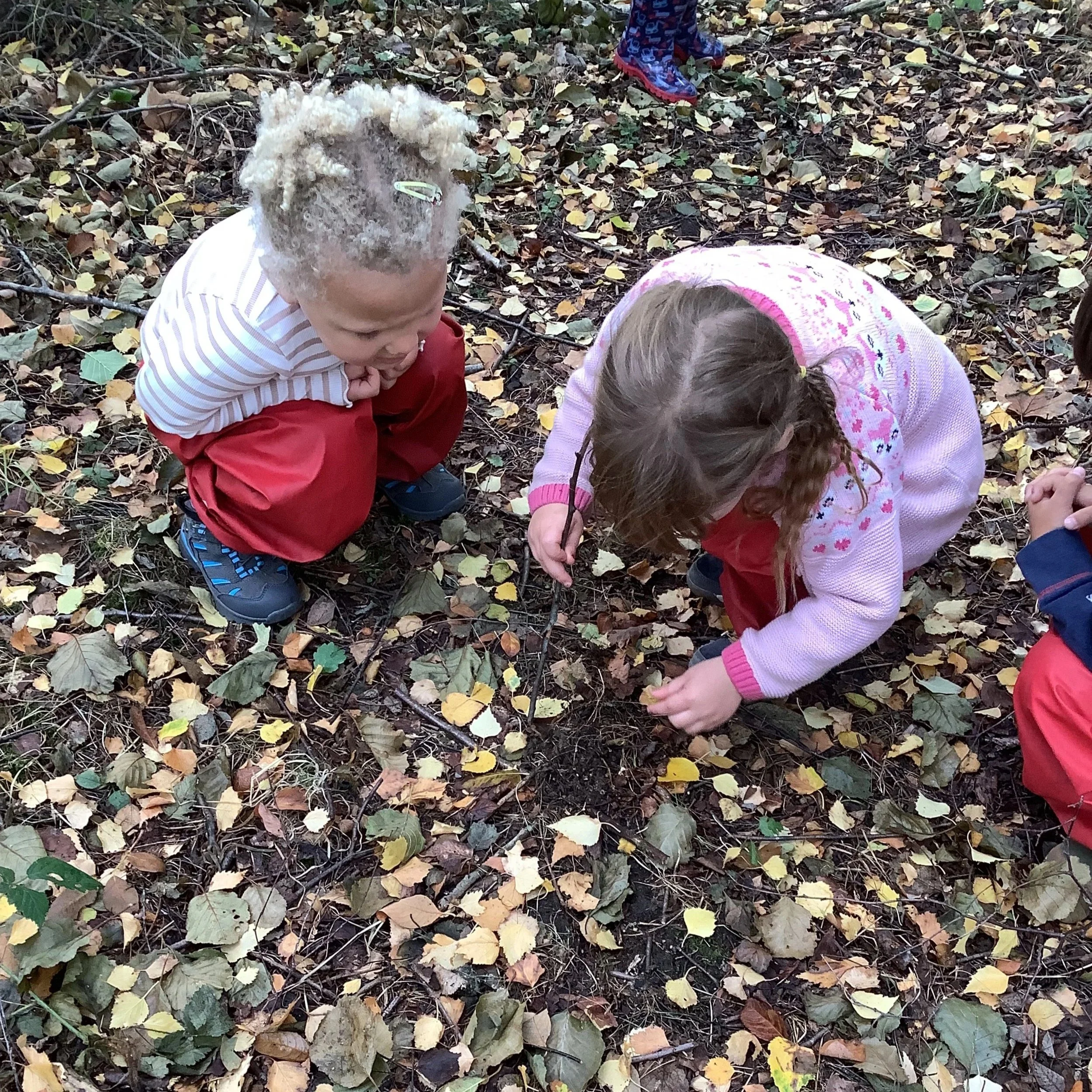 This week at forest school the children were intrigued by the discovery of yet more acorns! But this time we noticed something a little different. Some of the acorns were beginning to sprout roots. We chatted about what that could mean and what could happen in the future. After identifying trees in the morning, the children were all aware that if we planted the little acorn, we may grow our very own oak tree. Now this would be an amazing experiment and so we took a couple back to nursery to see if we could grow one. The other children wanted to collect the acorns together in a pile for the squirrels. We had engaged in this activity in a previous week and when the children noticed the pile was gone, they believed the squirrels had taken them and they should repeat the activity, helping the squirrels in the process.