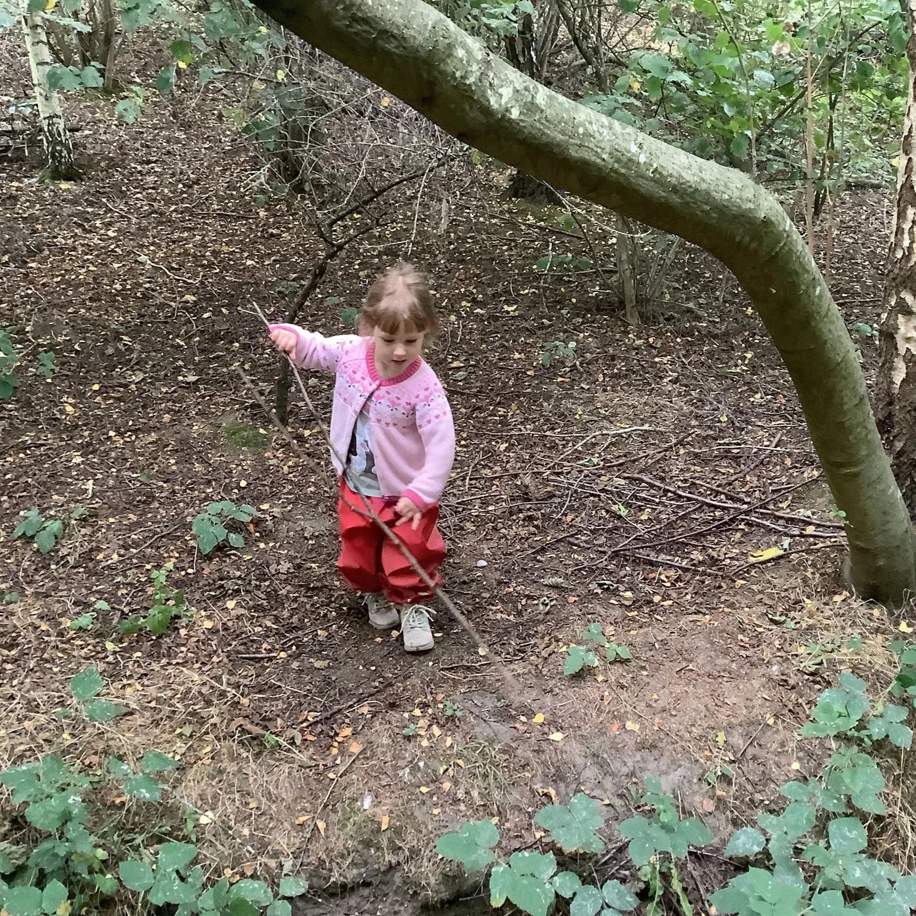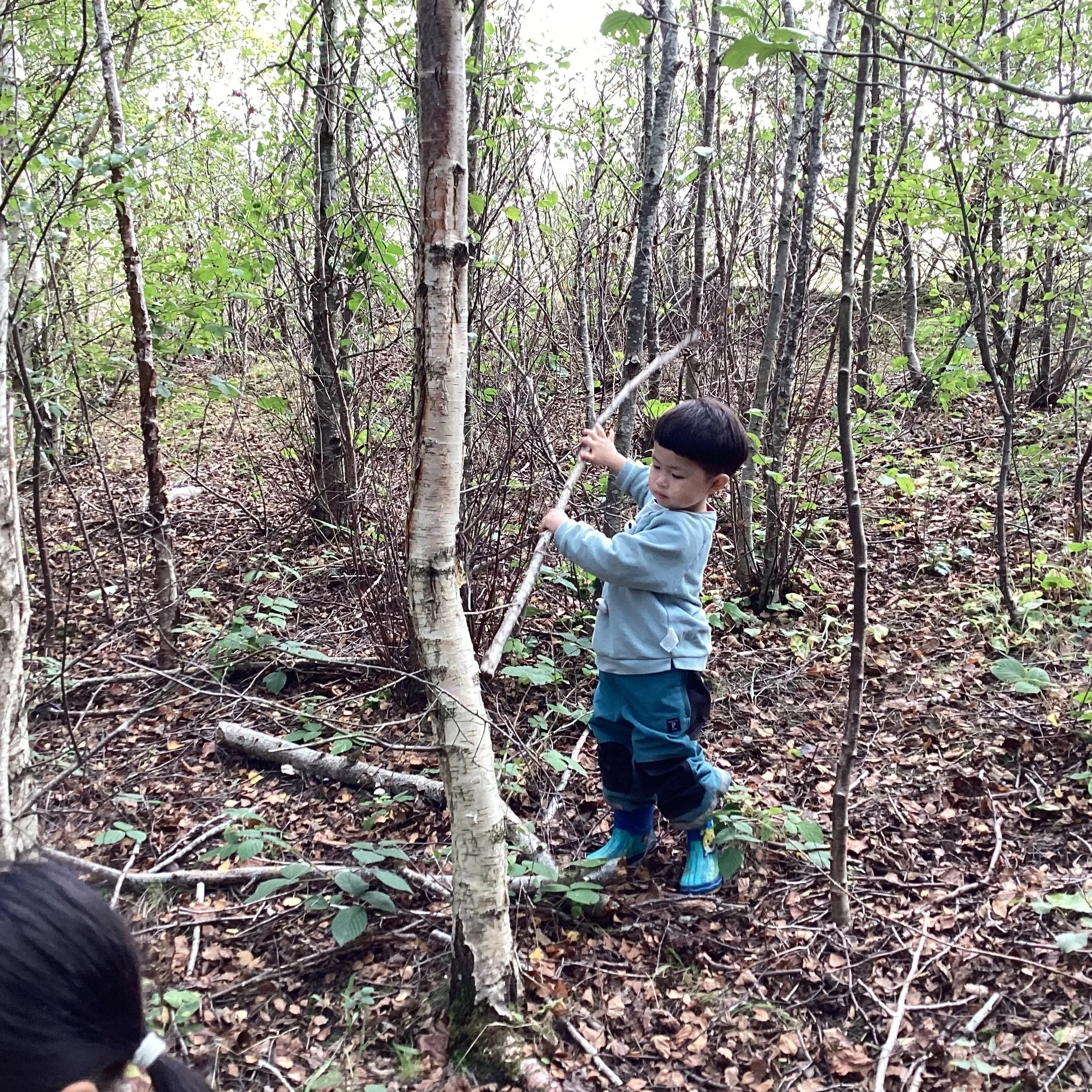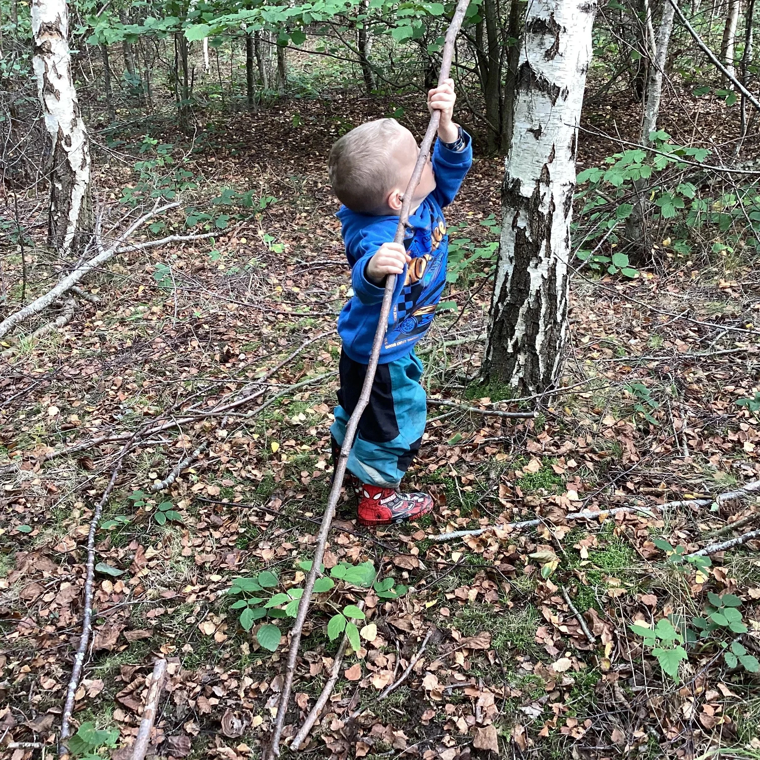 This week we welcomed a brand new group of children to forest school and wow, what adventures we had! We started our day discussing our forest school promises and learning about the environment. We wanted to find the big pond and it took quite a while but on our way we spotted some blackberries, an apple tree and a silver birch! We spotted a large branch sticking out of the ground. Some of the children decided to try and pull it out but it was stuck! Even teamwork couldn’t get the branch out of the ground but it did create lots of conversation, negotiation and compromise.