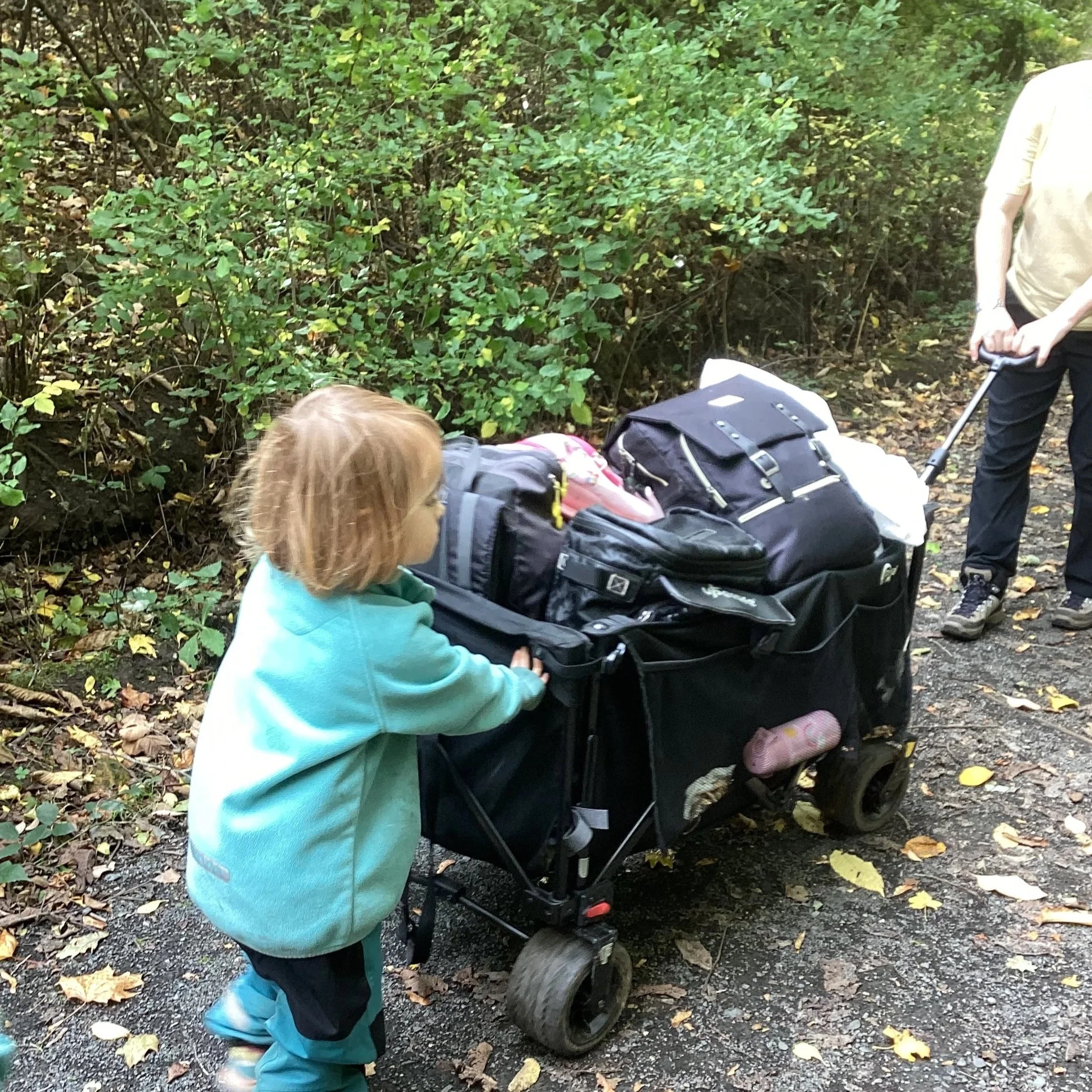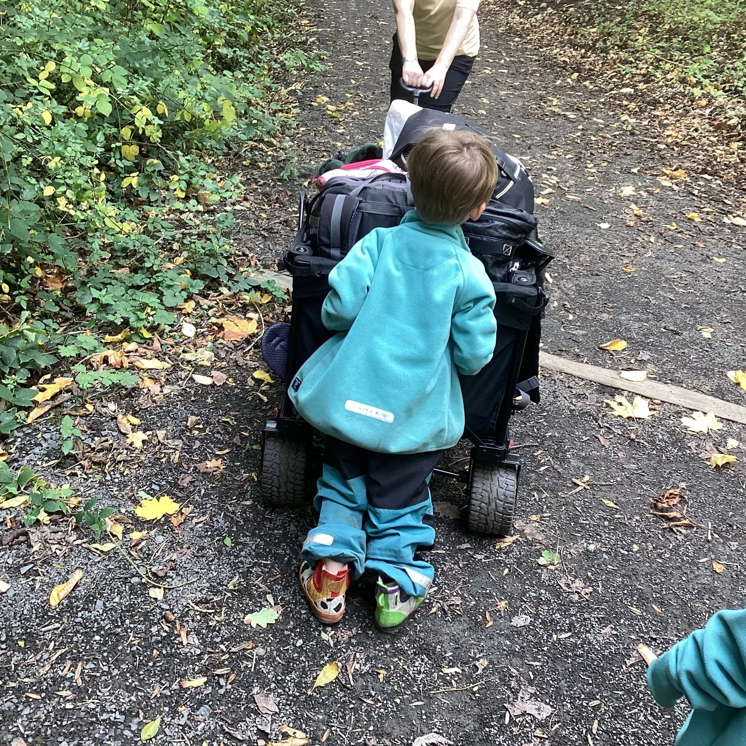 This week was fire week and the children were very excited to cook on our open fire. We began our ‘three course’ meal with garlic bread. This is always a favourite! For our main we had loaded wedges and wow were they popular! Dessert was rice pudding. With our tummies full, we decided to head off into forest school for an explore. Our trolley was very heavy this week as it was laden down with our dishes ready to be cleaned back at nursery so it was all hands on deck to get the trolley through the forest. The children, as usual, were amazing and supported the adults by helping to push the trolley over the big bumps along the way!