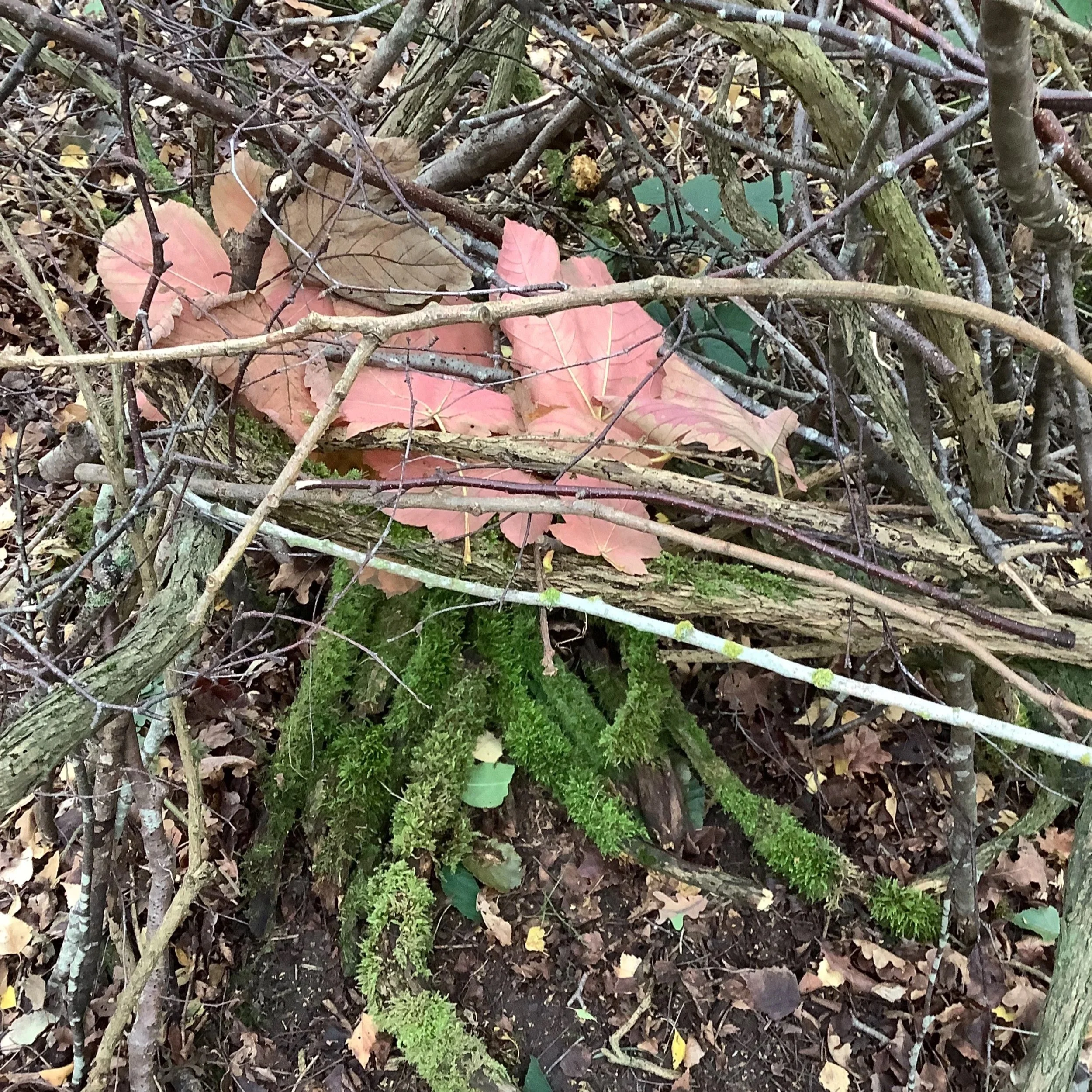 In the afternoon, we continued our explorations and discovered several log pile houses. Who could live there? Our mind went straight to the Gruffalo story. Who lives in the log pile house? A snake of course! We helped to develop the houses by adding more sticks. By the time we were finished, they were fine looking houses.