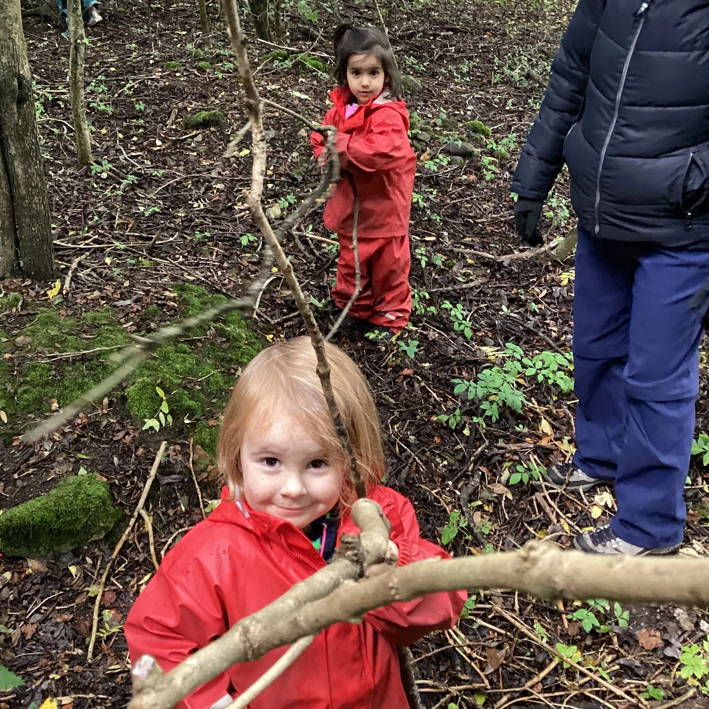 Our afternoon explorations found us in a wooded area where the children got to work building dens. Again, lots of problem solving skills were used to work out how to build a roof and walls which were secure. The children attempted building the den with various lengths of branches. They soon discovered that the longer branches were easier to build with but some were a little bit bendy which led to more discussions about how to make the walls secure enough so we could (in the words of one child) “live inside forever!”.