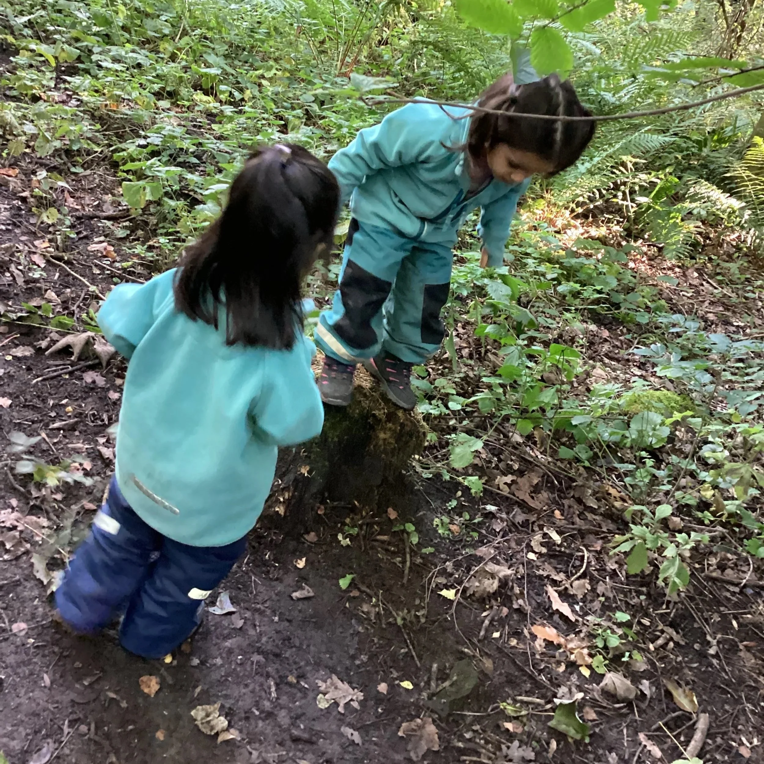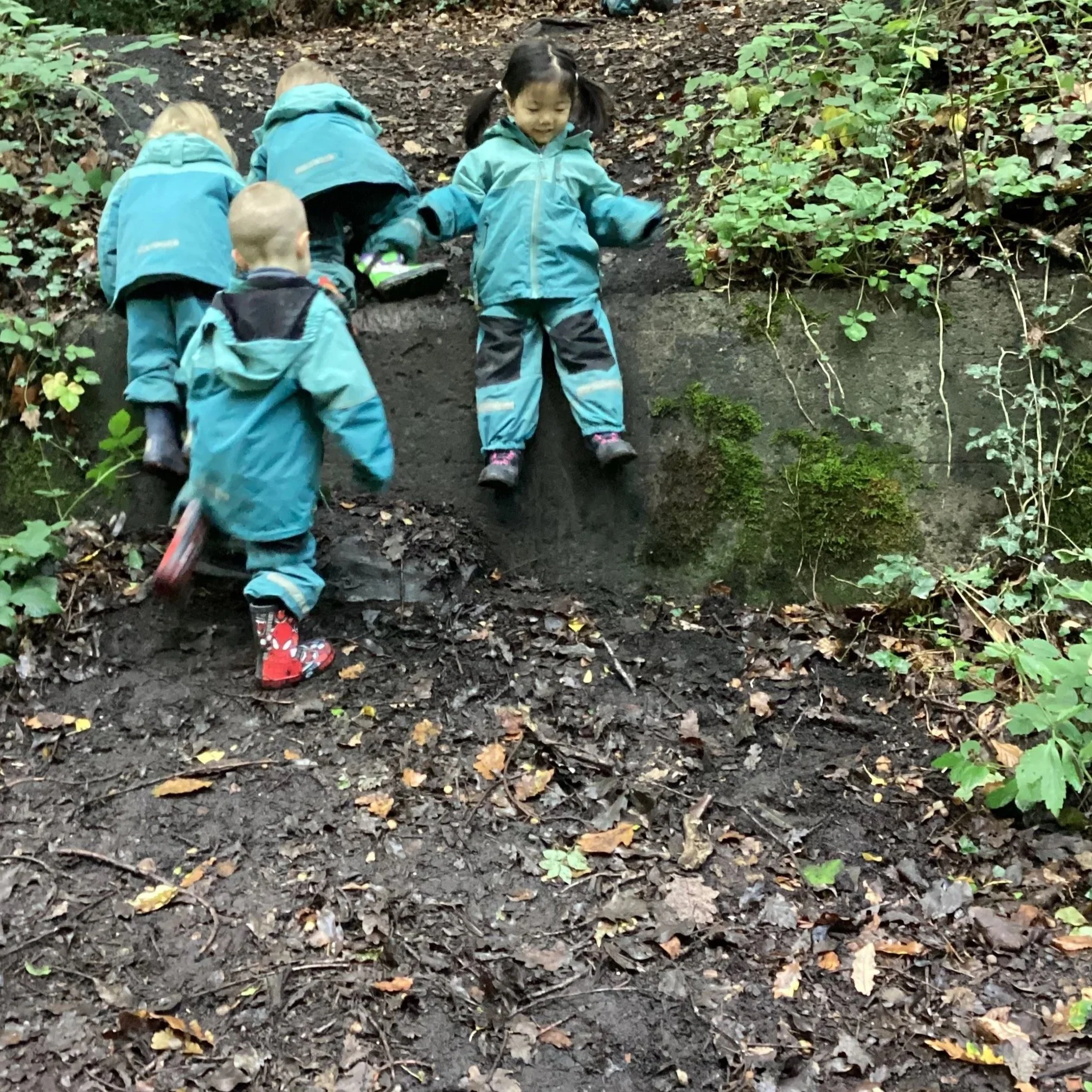 This week there was a lot of climbing and jumping from different heights. The children have been developing their confidence in the woodland and as the photographs show, they are happily exploring risk taking too.