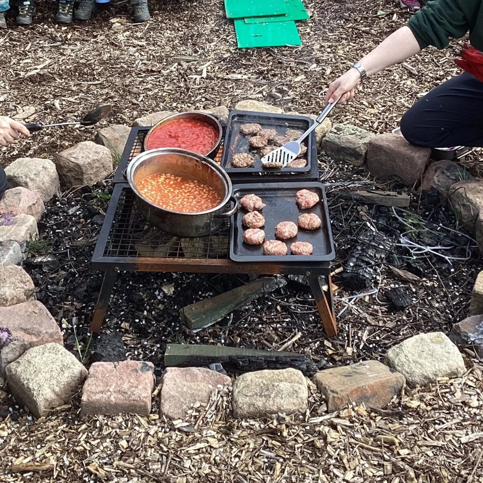 Once our fire was established and burning well, we moved on to preparing our food. We decided to try something new and began creating homemade patties, which smelled delicious as they cooked over the fire. The children really enjoyed hearing them sizzling in the pan, adding to the excitement of the experience.