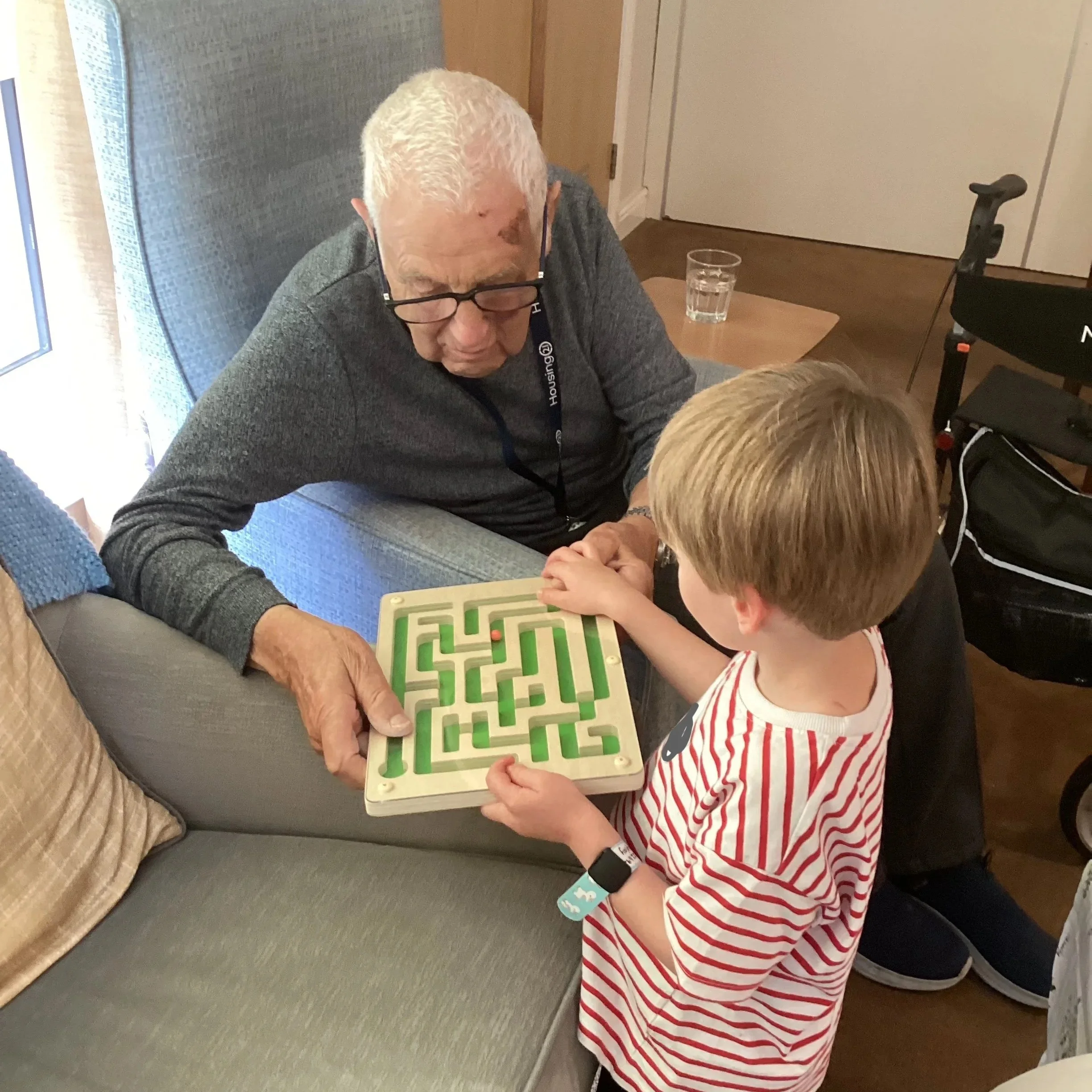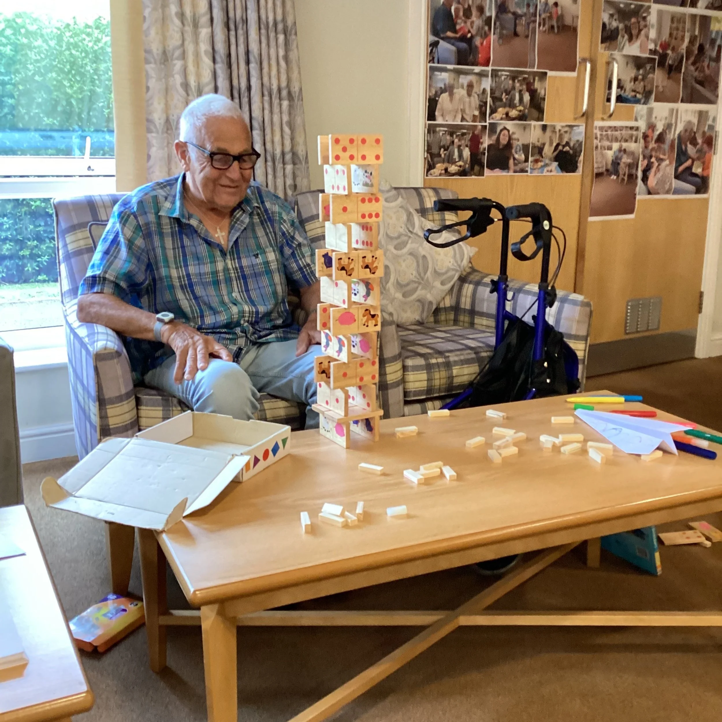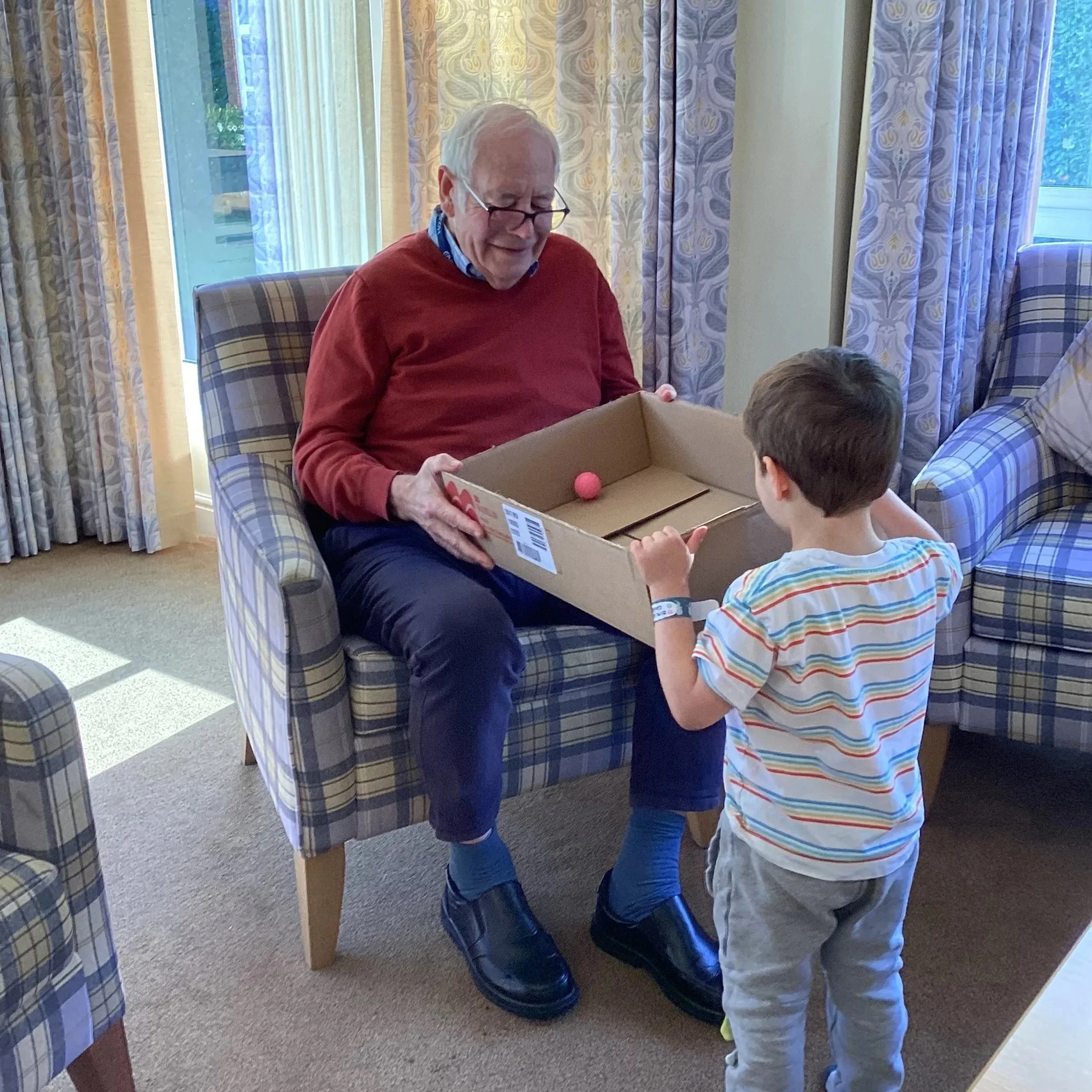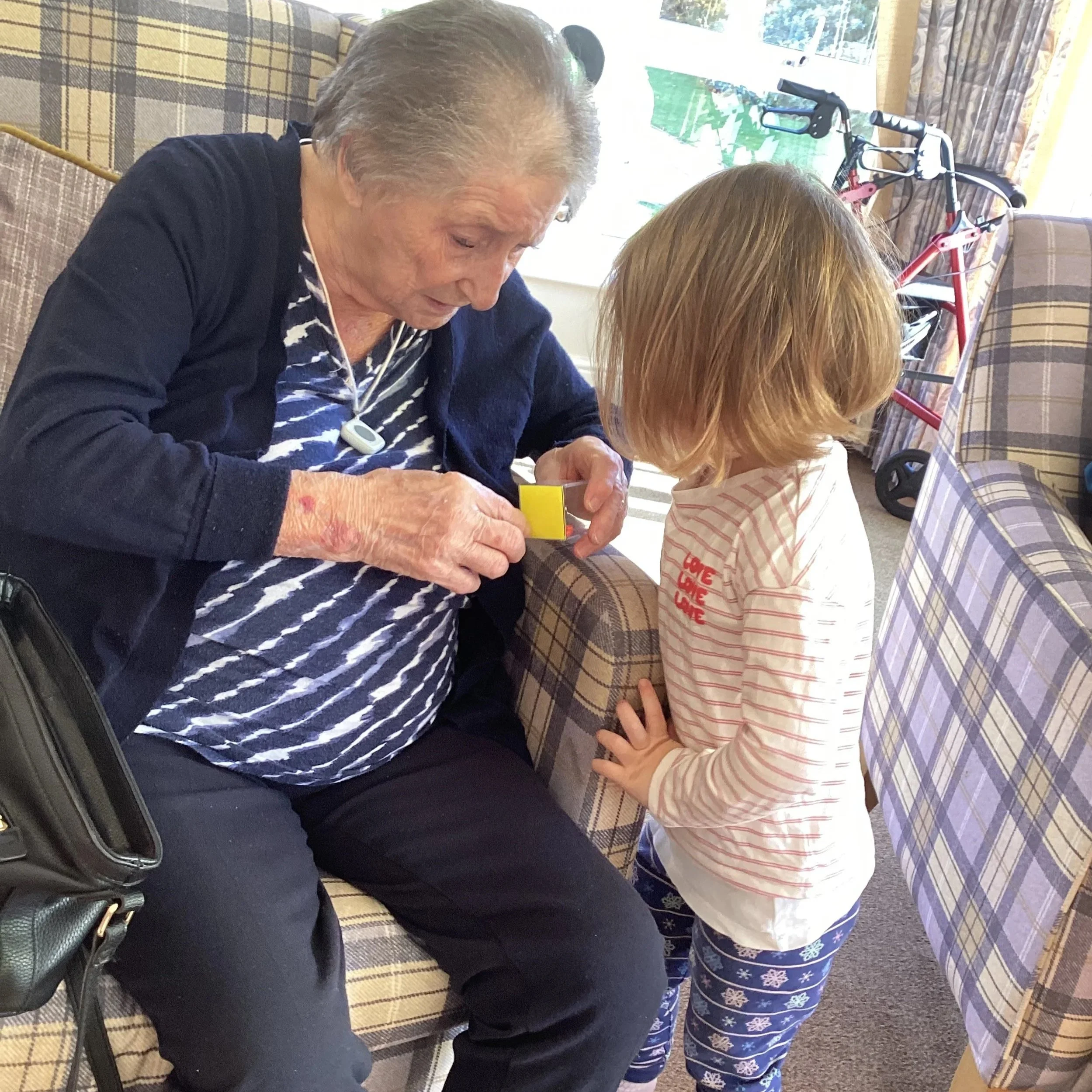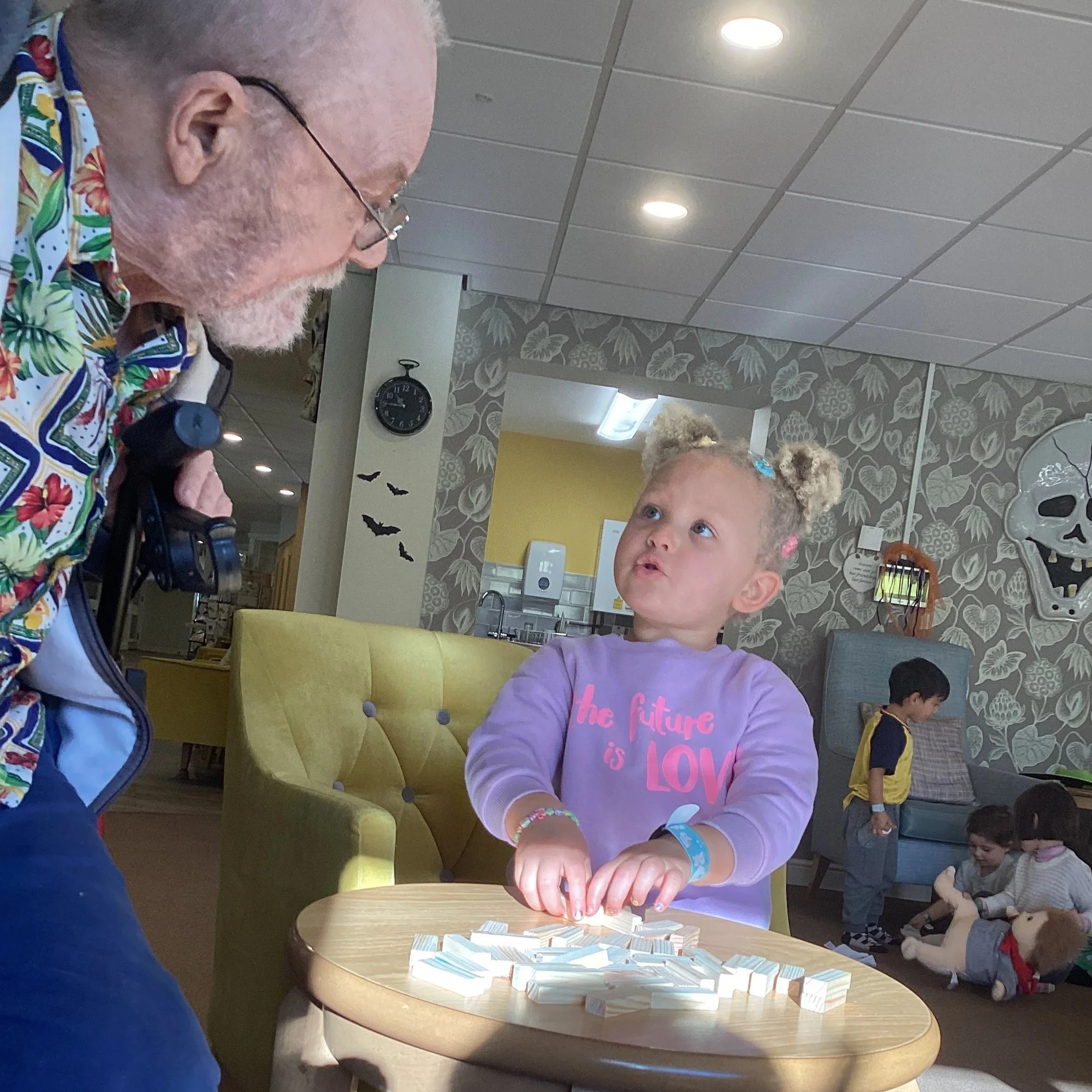 The children have established firm friendships with the residents and are becoming more and more confident in the space. The children love nothing more than teaching their friends new skills which is often reciprocated by the adults. On this occasion, the child asked the resident if she would like to play a game. The resident replied, “yes, but I don’t know how to play". The child then said “I’ll show you the game. You can have the red ones and I’ll have the green ones. You need to put yours on the white squares and I’ll put mine on the blue squares”. She continued to explain the rules of her game and the two played happily together. The older adult praised and encouraged the child, telling her she had really enjoyed her game! The huge smiles of achievement were clear to see.