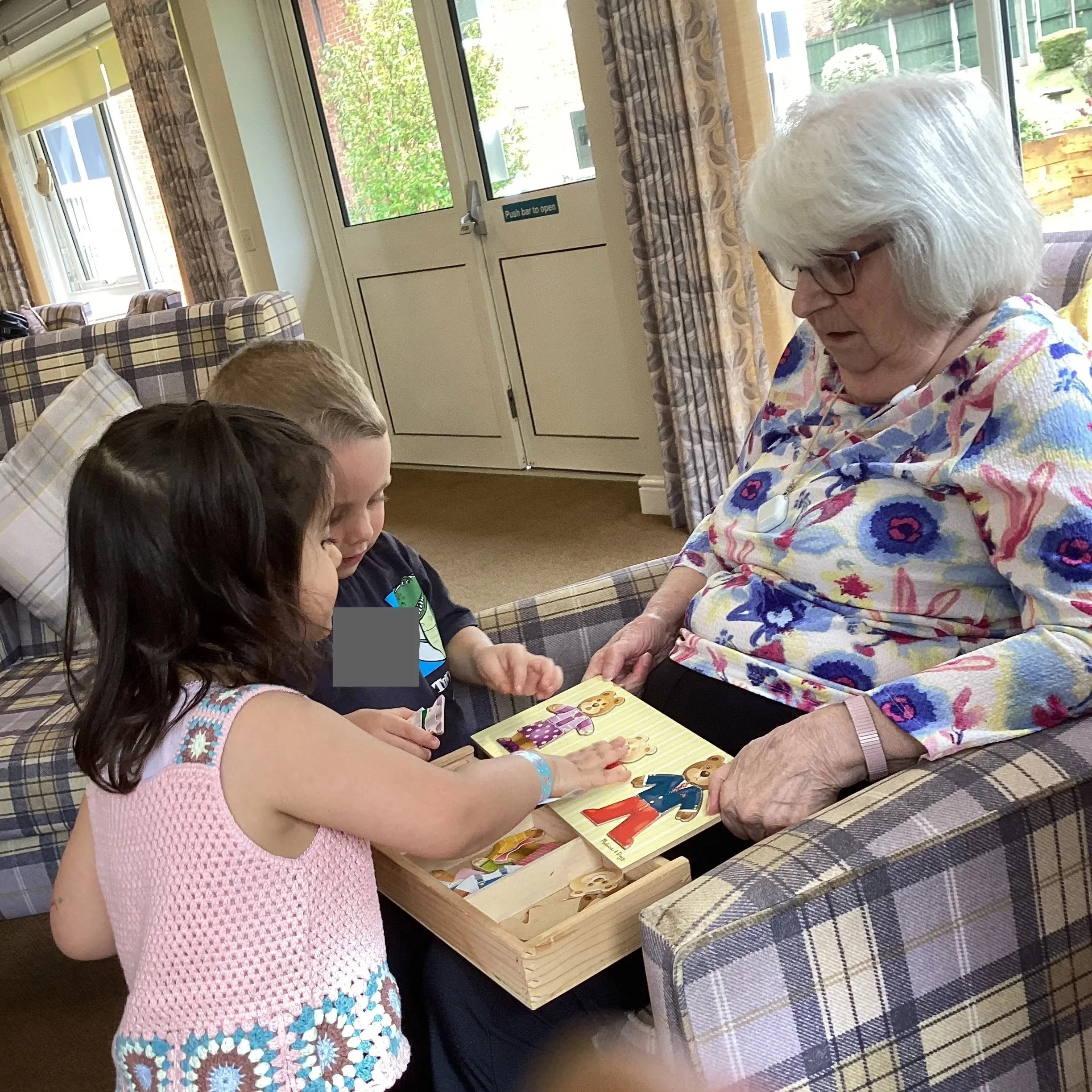 We are already beginning to see joint interests emerging. Our dolls, puzzles and games seem to be of a huge interest to both the children and adults. The children are able to clearly demonstrate to the adults how they care for others. One of our children demonstrated how to use a nappy with sticky flaps as the resident was not familiar with this type of nappy. The residents in turn, demonstrated to the children how to complete our puzzle cubes. We are able to observe the collaborative interactions between young and old as they teach each other new skills. It is truly heartwarming to watch.