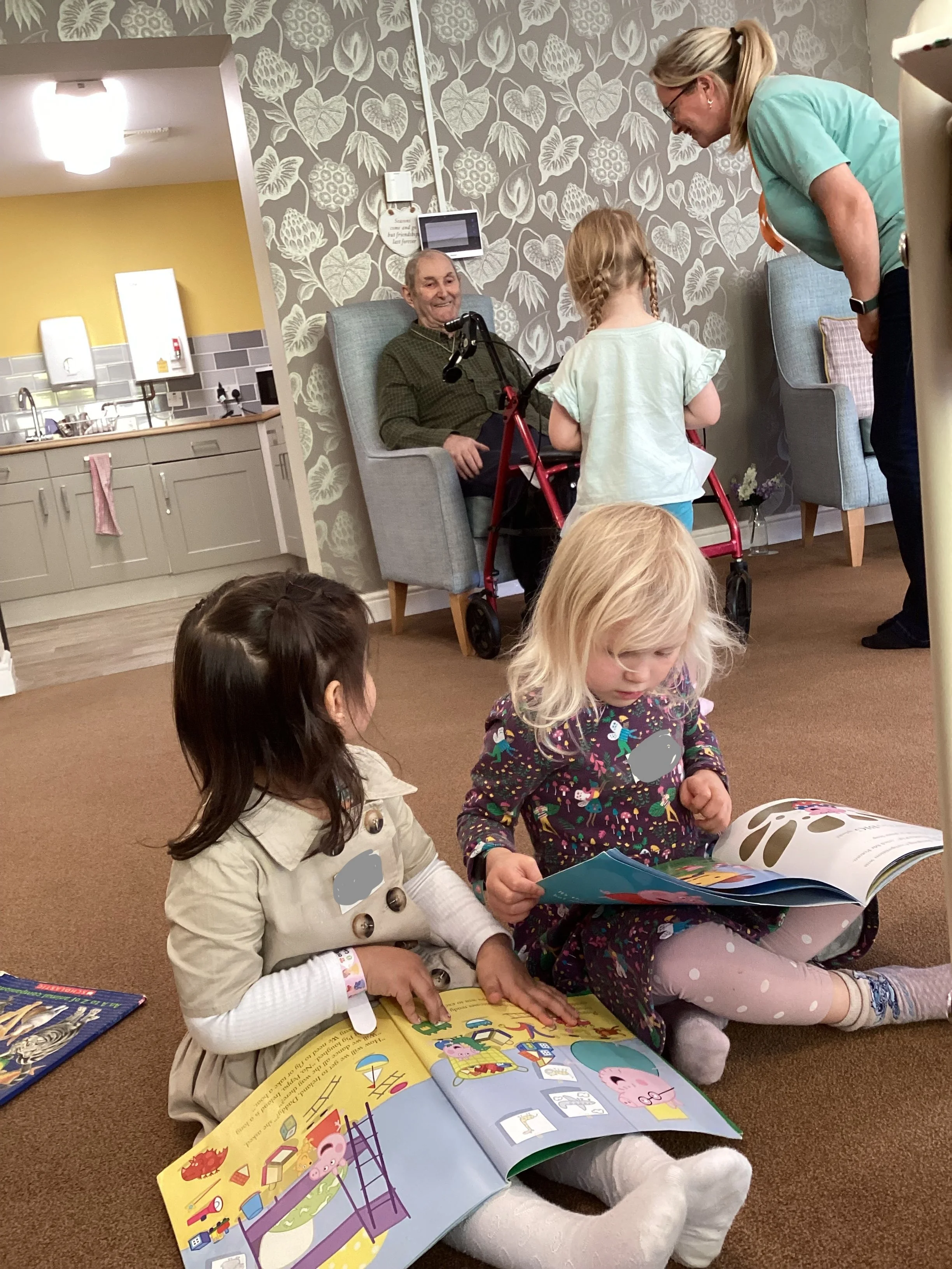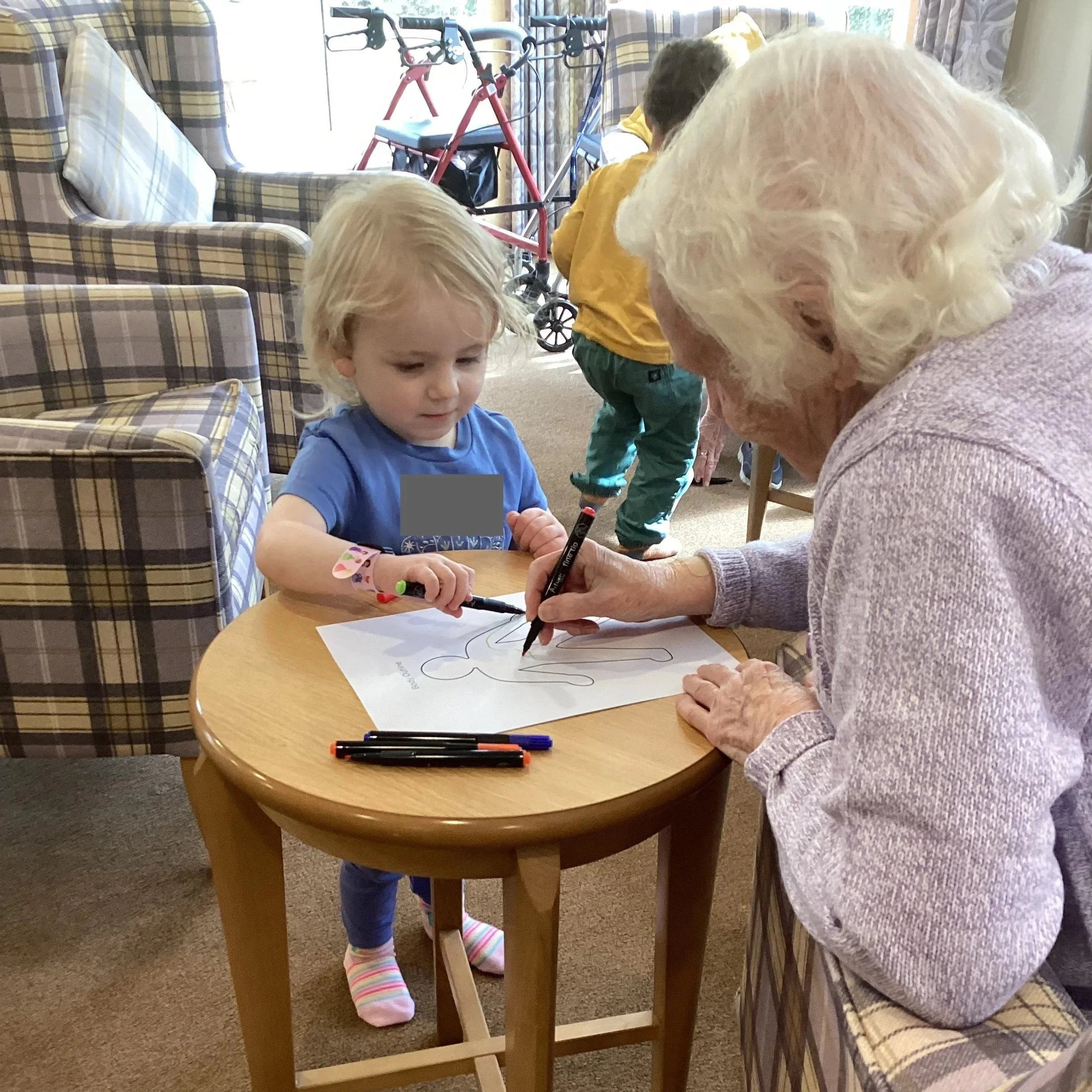 This week the children were so excited to go back and meet their older friends. They happily chatted on the minibus about the care village and what they would do. They had even remembered some of their special friends names. One of the special relationships we have been observing is between a little girl and an older lady. They were immediately drawn to each other and have spent most of their mornings together. They have enjoyed building, drawing and reading. This week, they both enjoyed caring for one of our dolls. They supported each other with nappy changing, feeding the baby and creating a cot with a cardboard box and cushions.