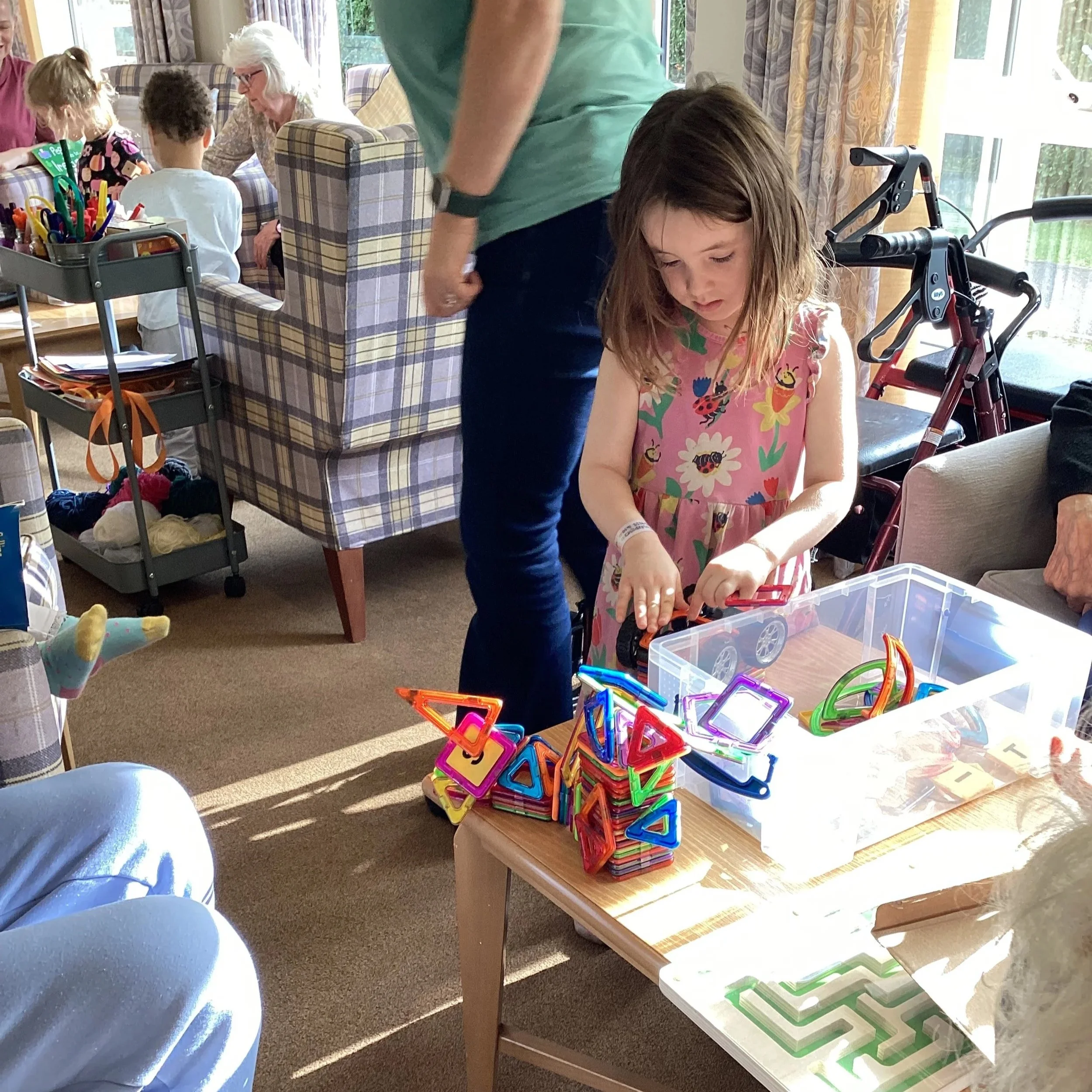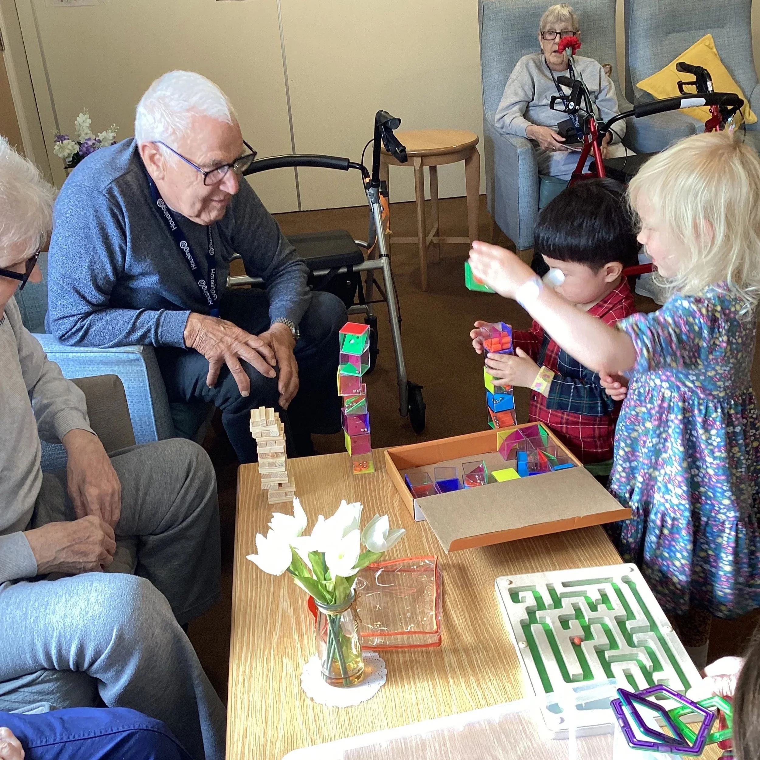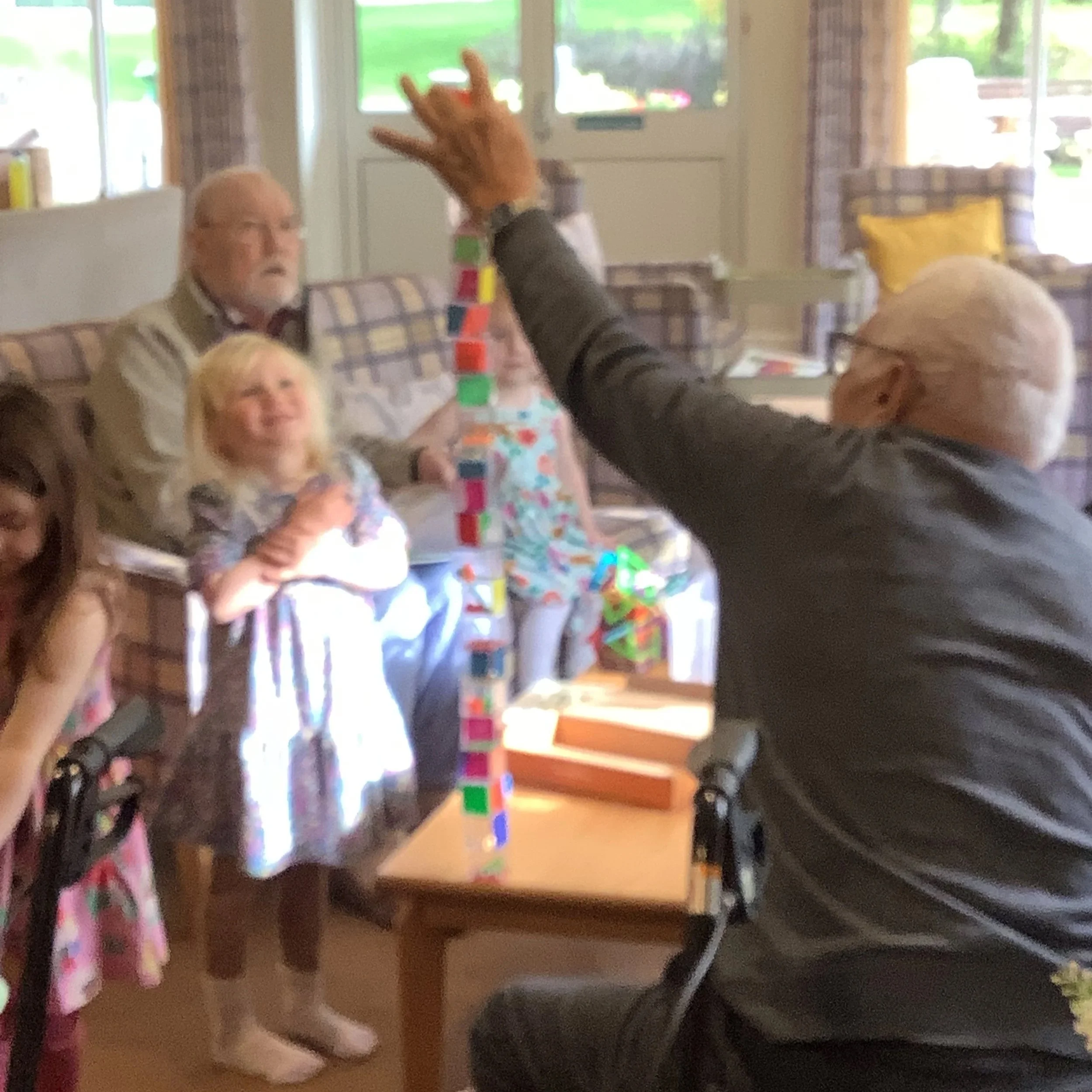 This week the children enjoyed exploring construction with their older friends. a small group of children and a couple of residents decided to build a tower of blocks. The tower started to get higher and higher and higher! Eventually the tower was so high that the children asked for help from their nursery grown-ups to place the next block on top. The tower started to wobble and then suddenly it came down with a great big crash! Everyone laughed together before trying to rebuild it.