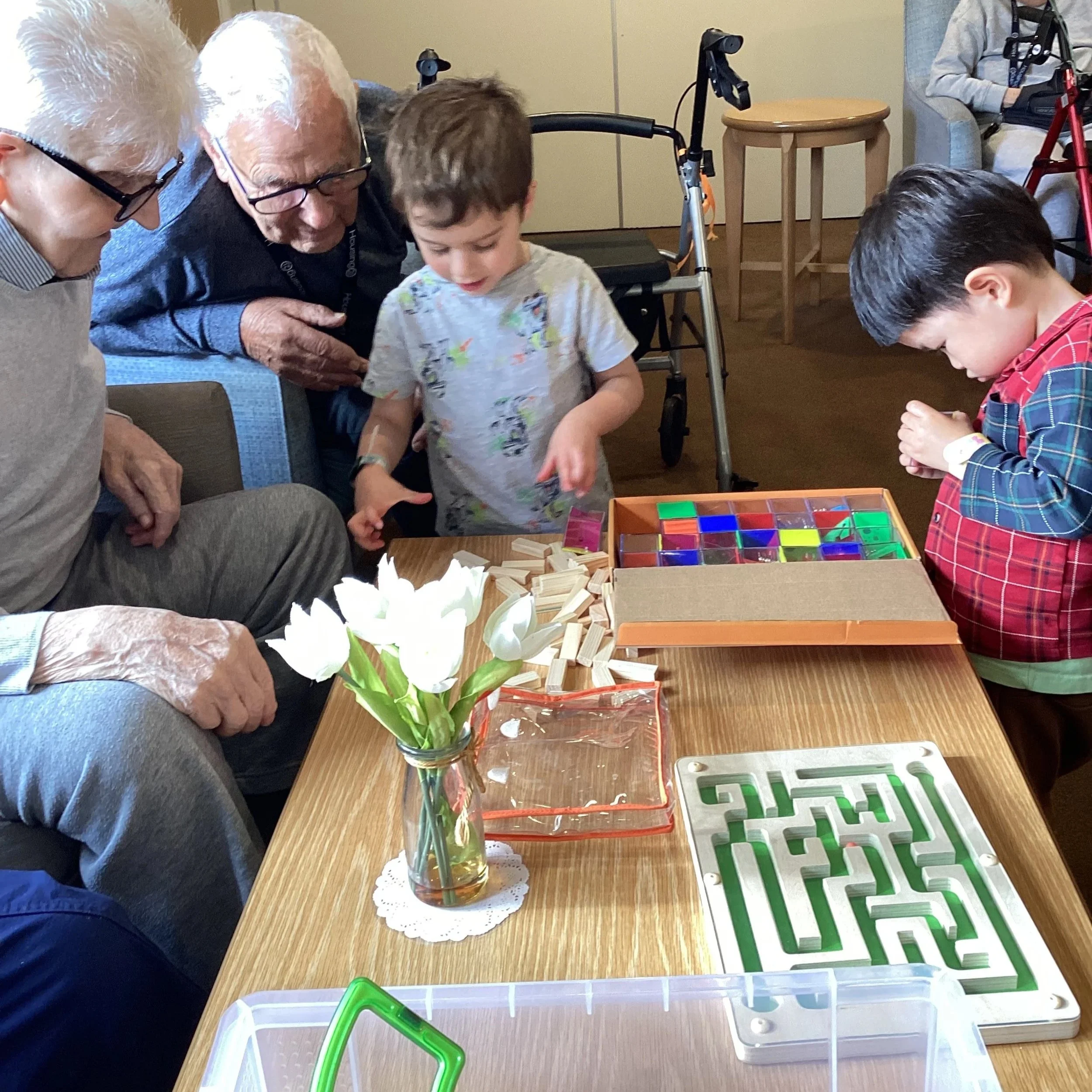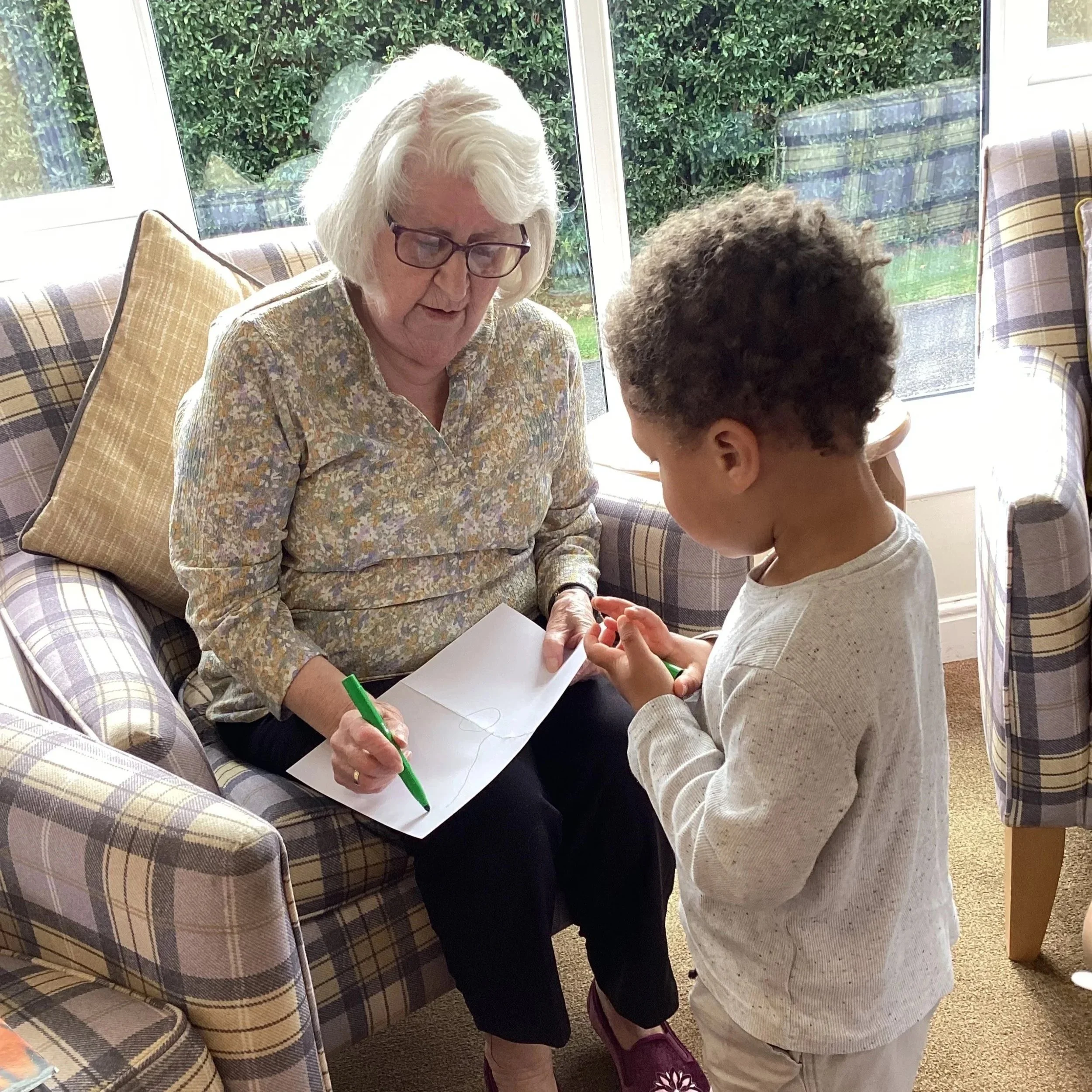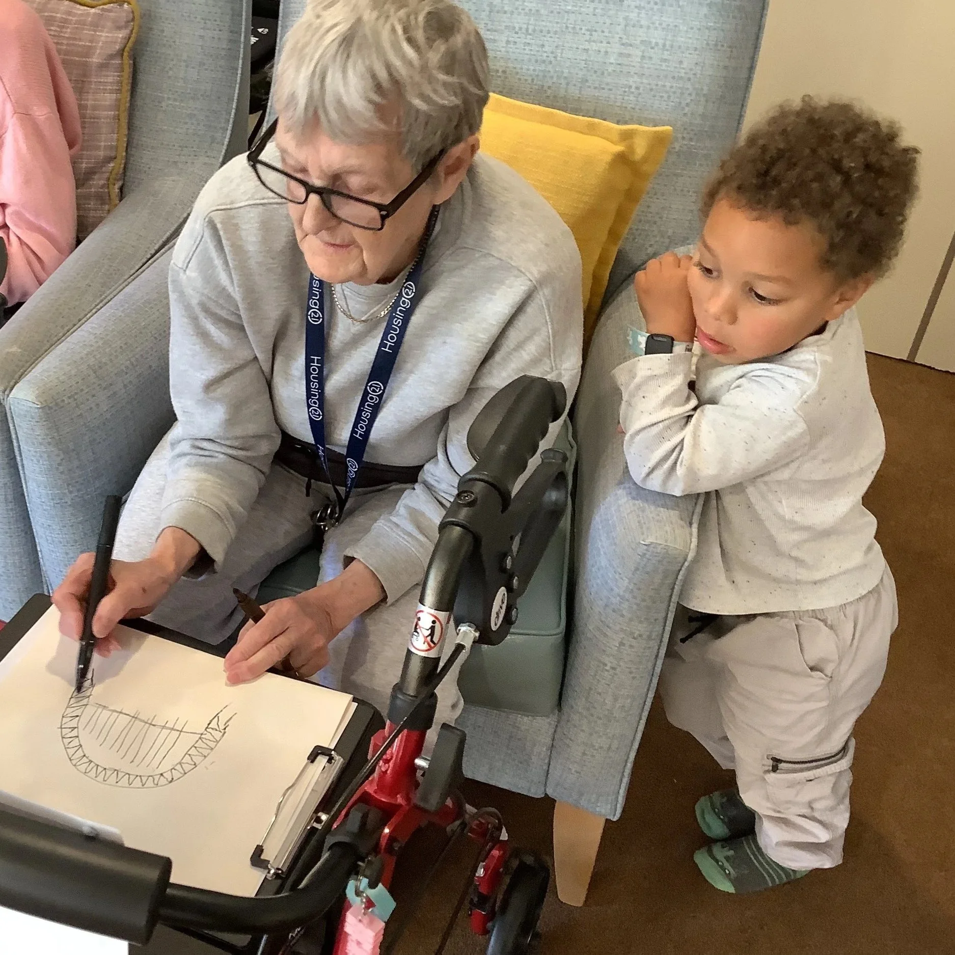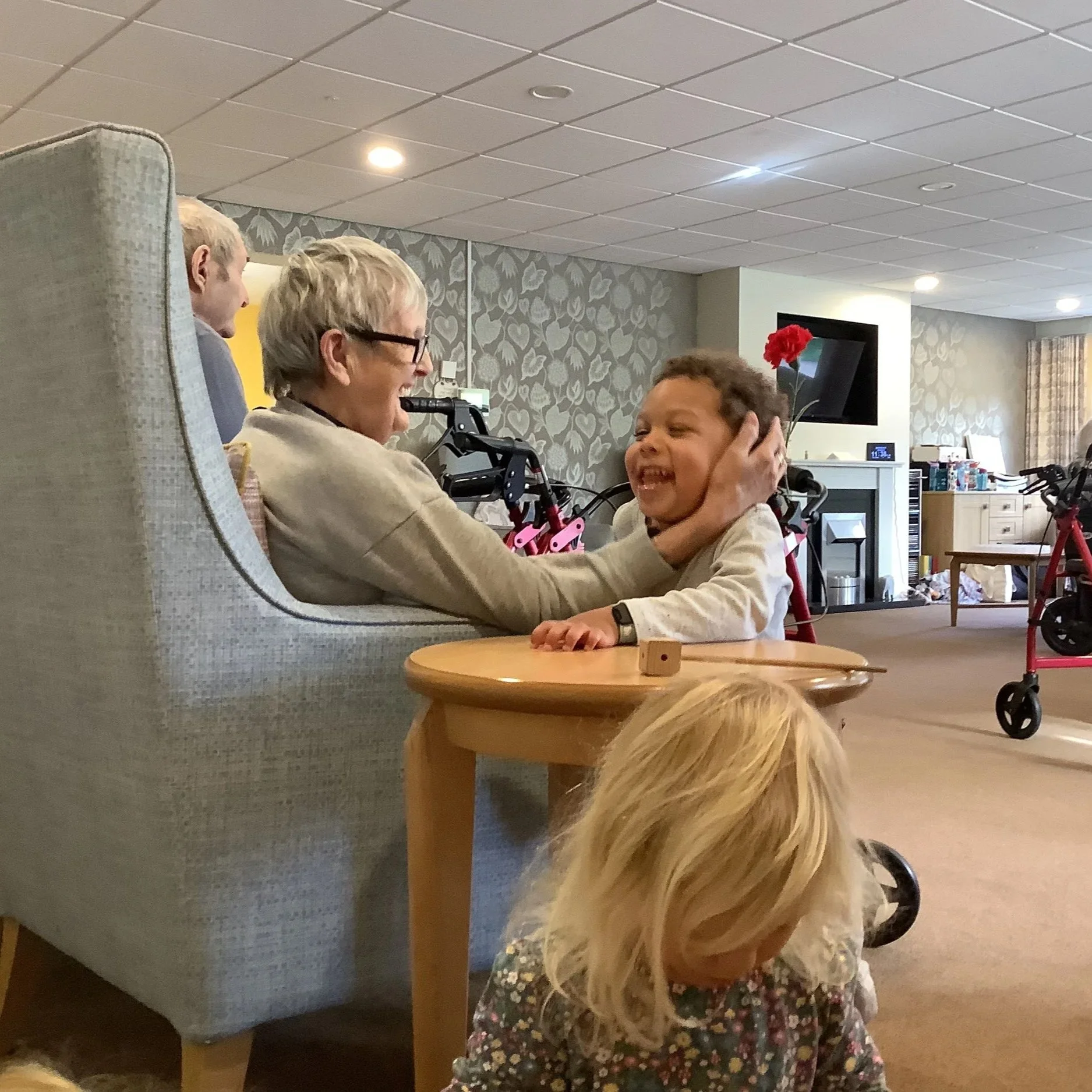 This week the children enjoyed exploring construction with their older friends. a small group of children and a couple of residents decided to build a tower of blocks. The tower started to get higher and higher and higher! Eventually the tower was so high that the children asked for help from their nursery grown-ups to place the next block on top. The tower started to wobble and then suddenly it came down with a great big crash! Everyone laughed together before trying to rebuild it.