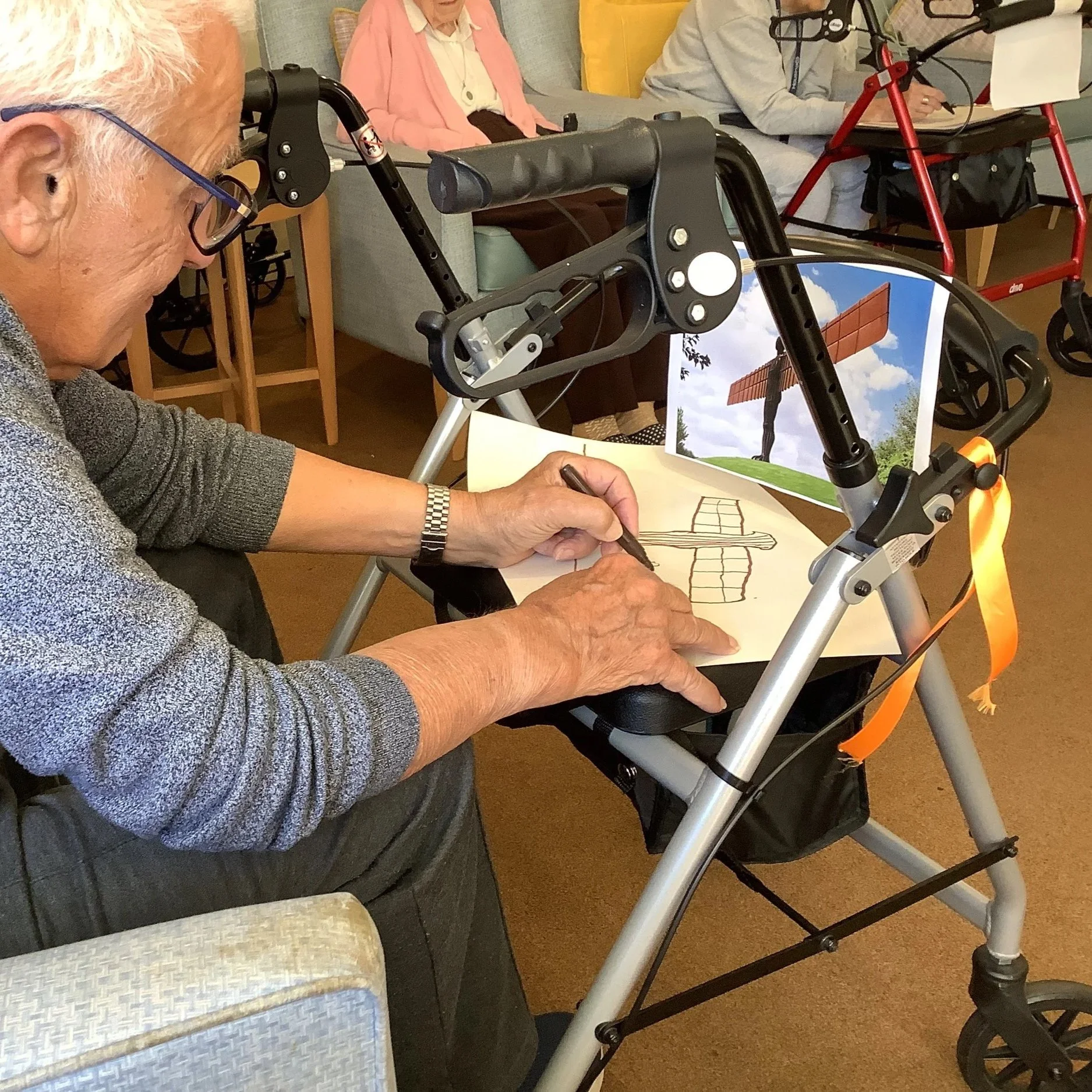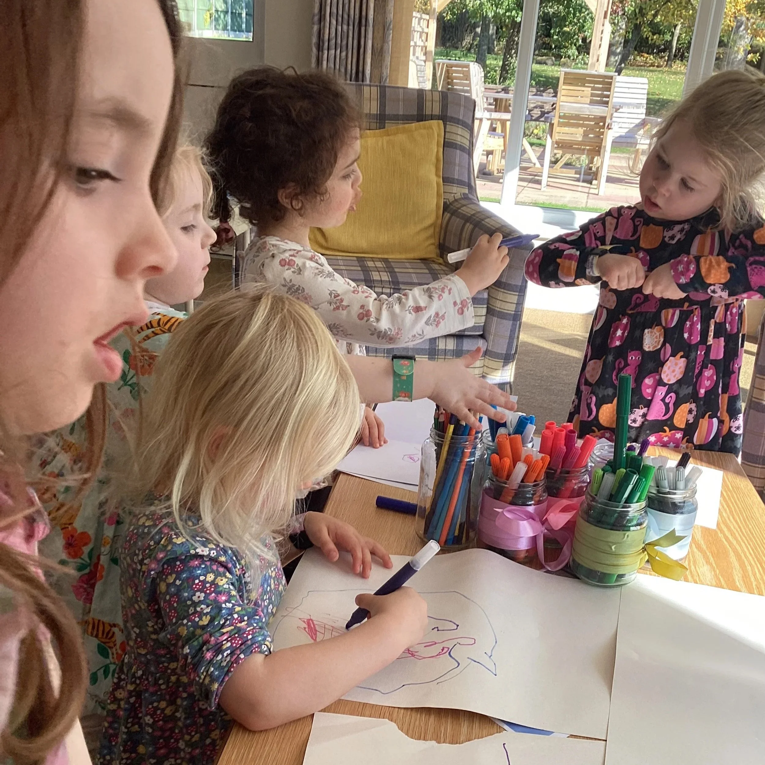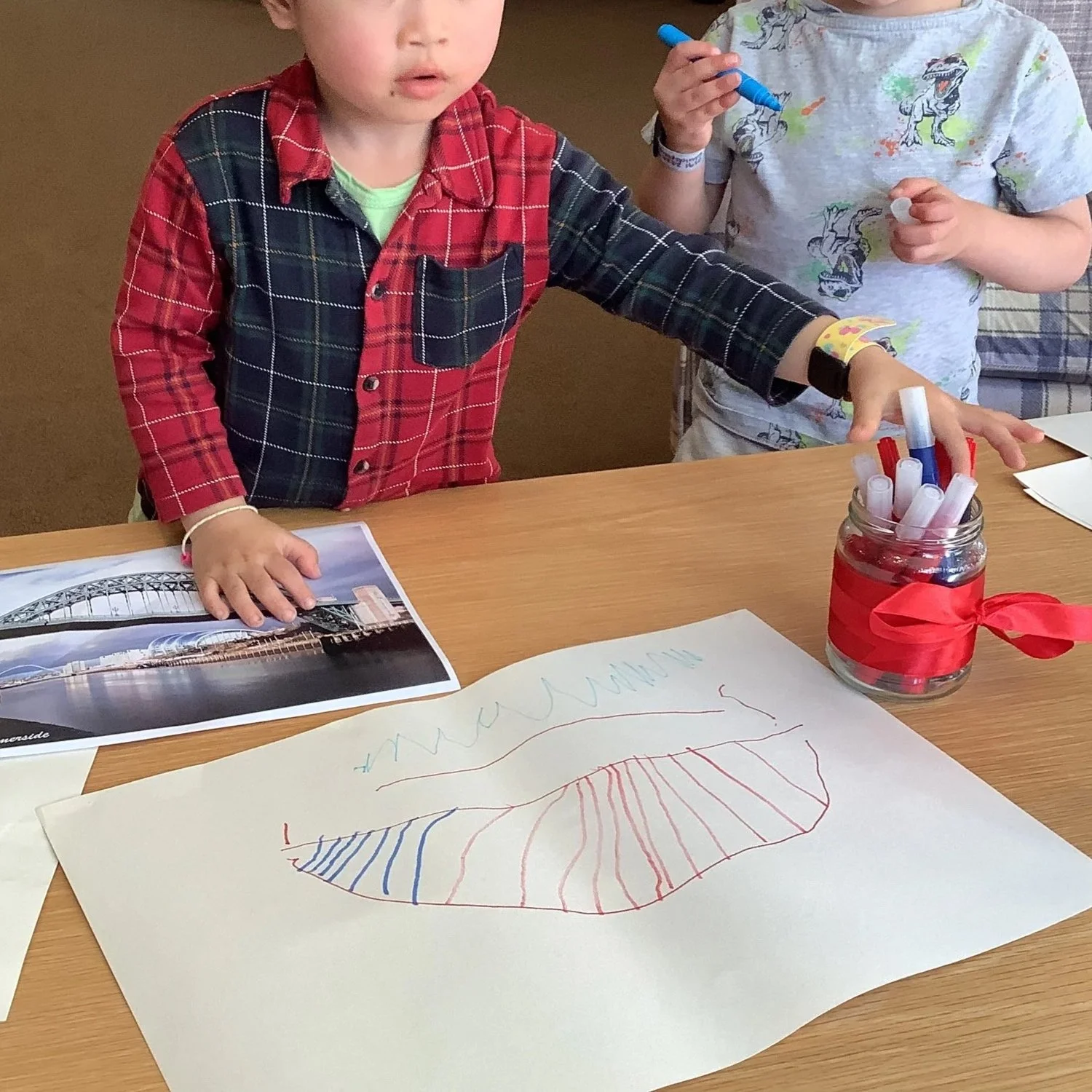 This afternoon we began talking about landmarks and local places of interest. One of the grown-ups showed everyone photographs of local landmarks which included the Tyne Bridge, Greys Monument, the Angel of the North, Newcastle Keep, the Millennium Bridge and the Glasshouse. Everyone got busy drawing their interpretation of these places. The children talked about the shape of the bridges, what colours they were and what they were made from. One of the children pointed out that the Angel of the North must be made from bricks as it is the same colour! Our drawings were then placed on the wall for everyone to see. We hope to add to our drawings on our next visit.