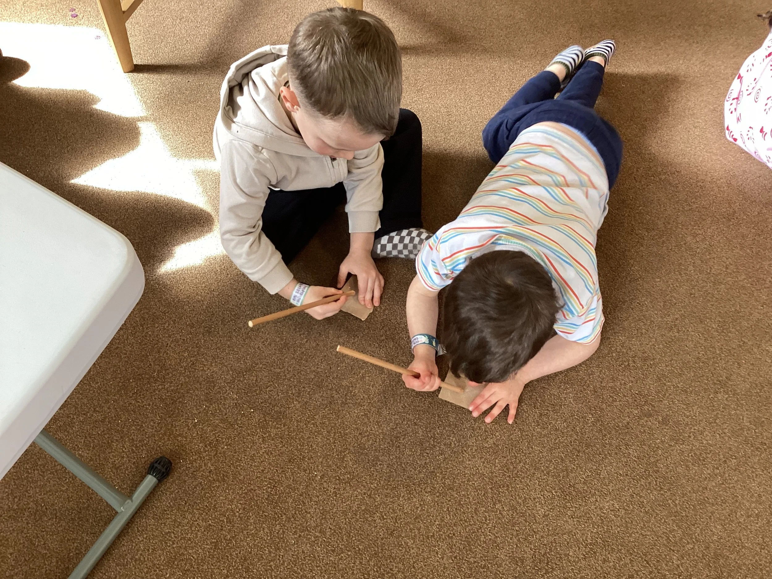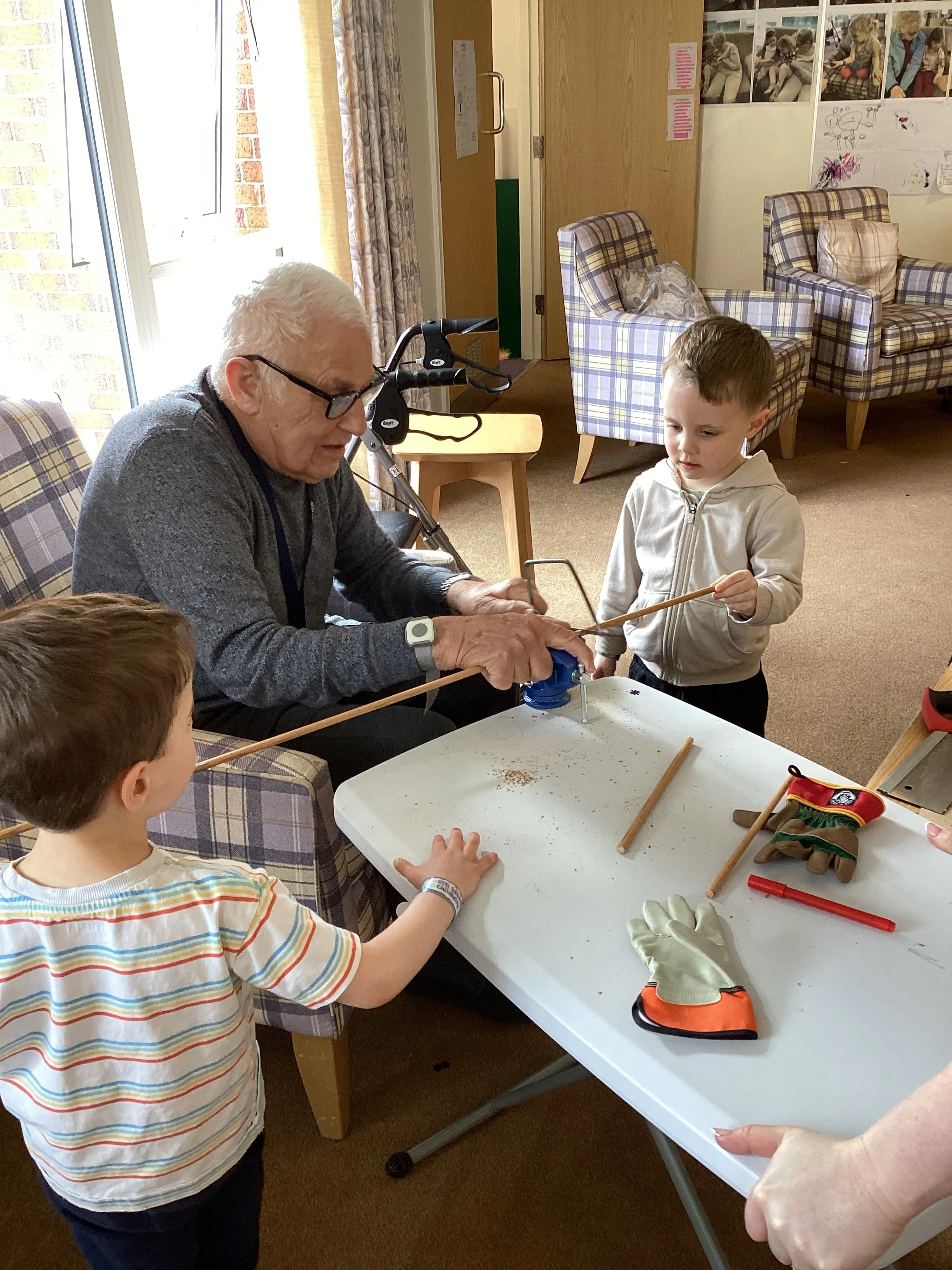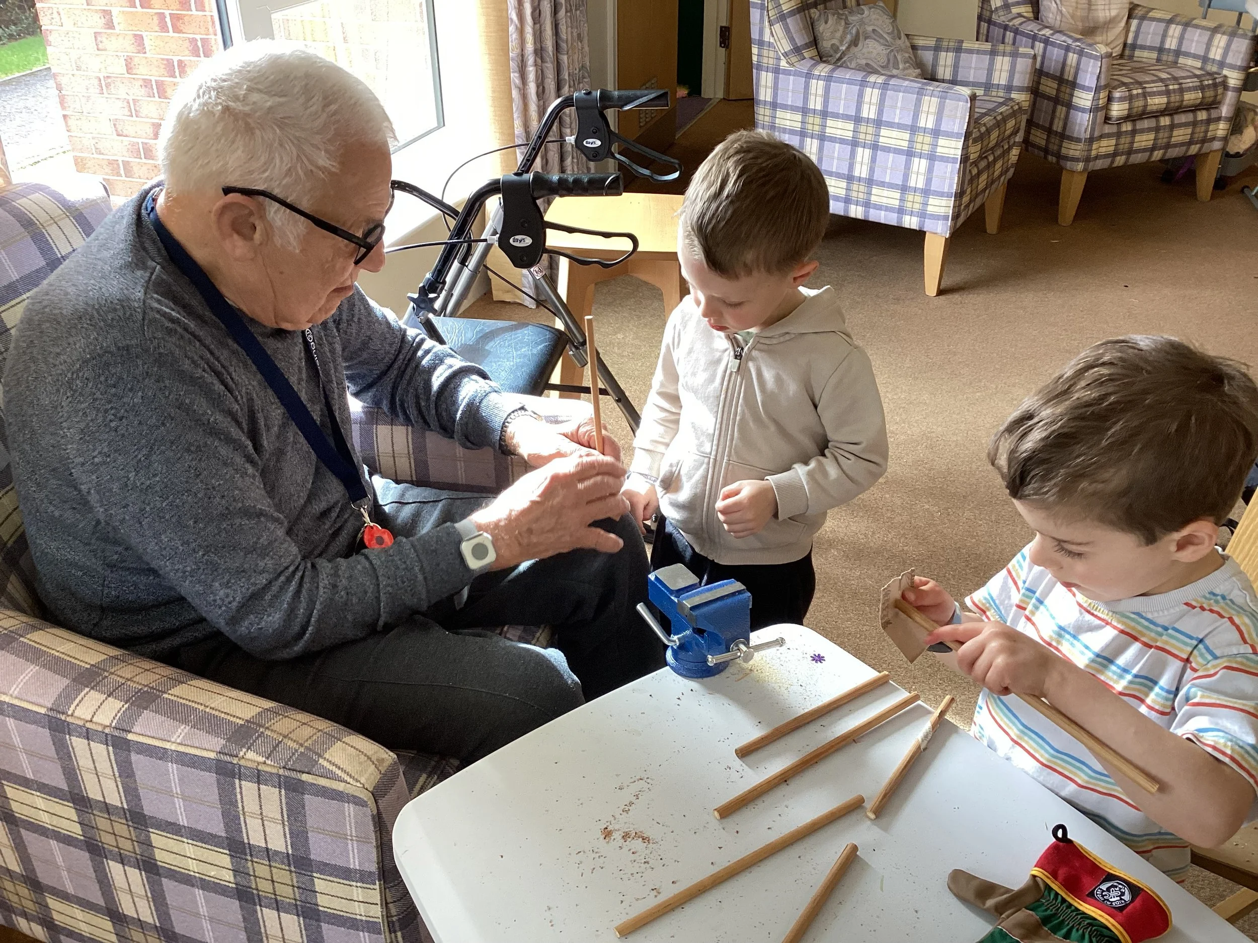 Inspired by the demonstration, they then set off with purpose, working together to ensure every dowel was safely sanded and ready to use.