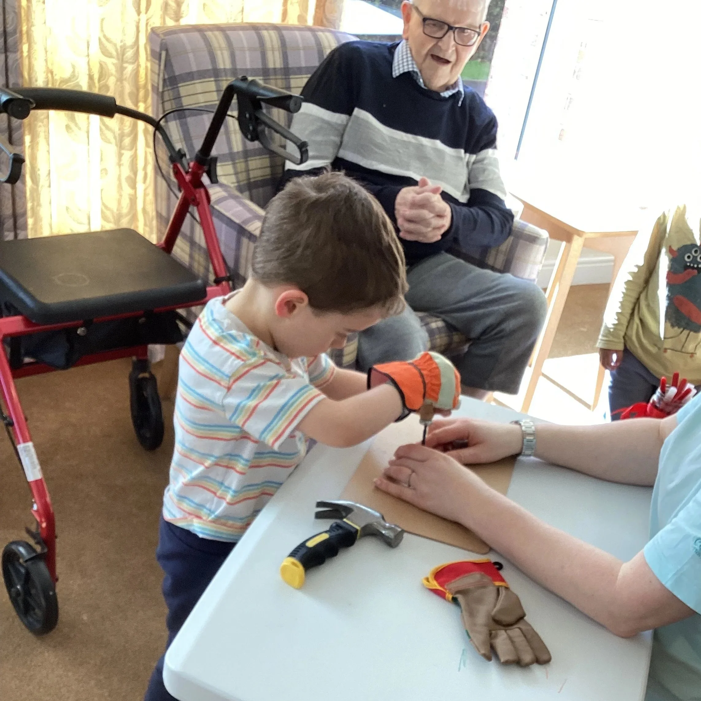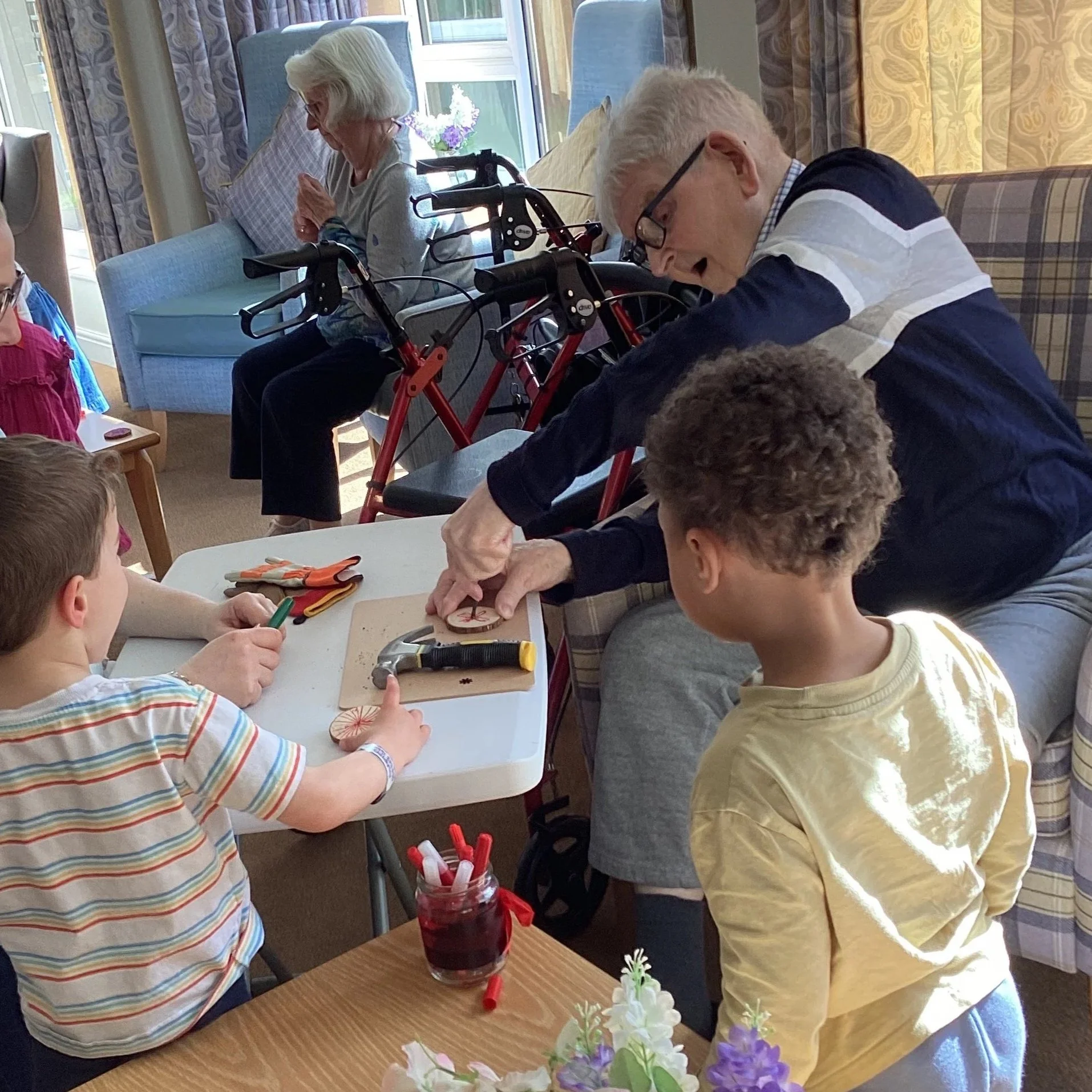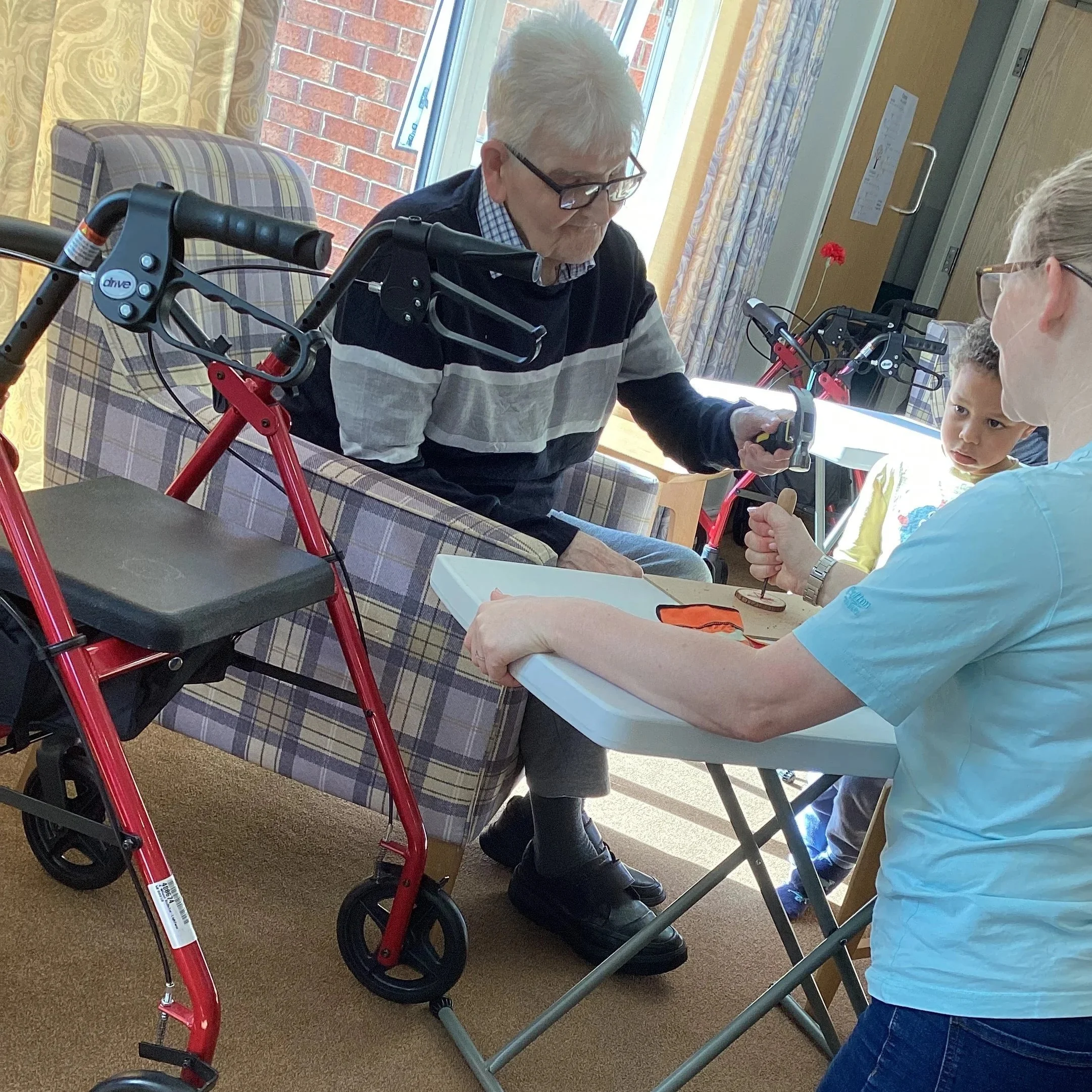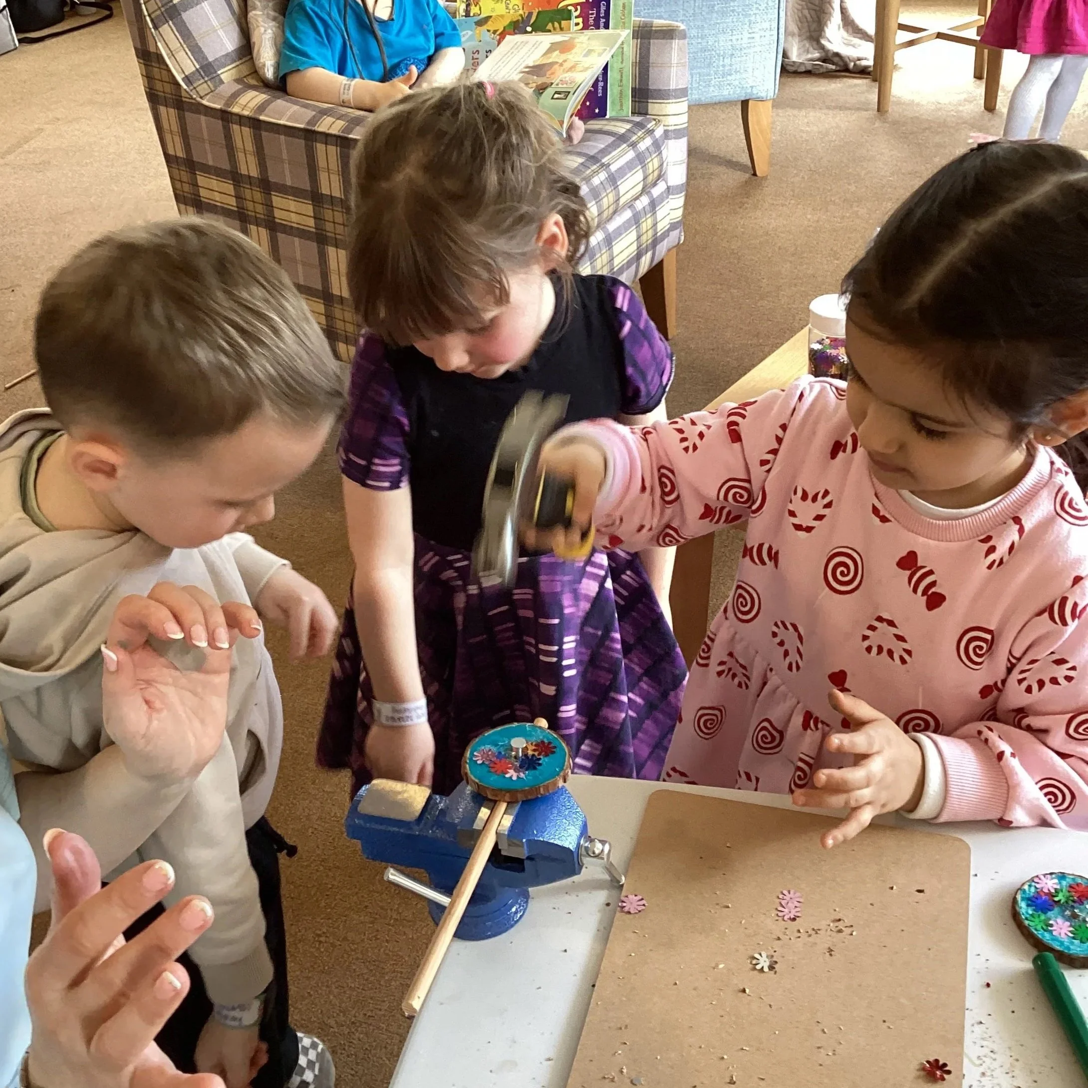 This week we continued our woodwork theme with our second group of children, and what a joyful, creative experience it was! The children and adults took great care decorating their wooden circles, thoughtfully choosing colours and patterns that reflected their unique ideas. With growing confidence, they practised sawing their dowels and safely hammering them into place, showing determination and focus throughout.