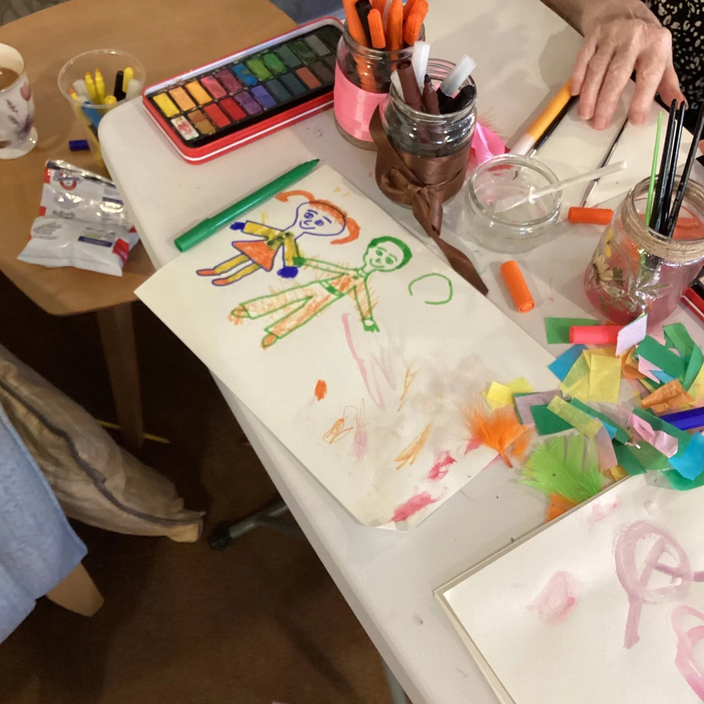 One of the children chose to collaborate with a friend to create a special family picture. She decided she wanted to draw herself and her brother and thoughtfully asked her friend to help by sketching the outlines of the figures. With great care, she described her own features and then her brother’s, bringing their personalities to life through her words and ideas.