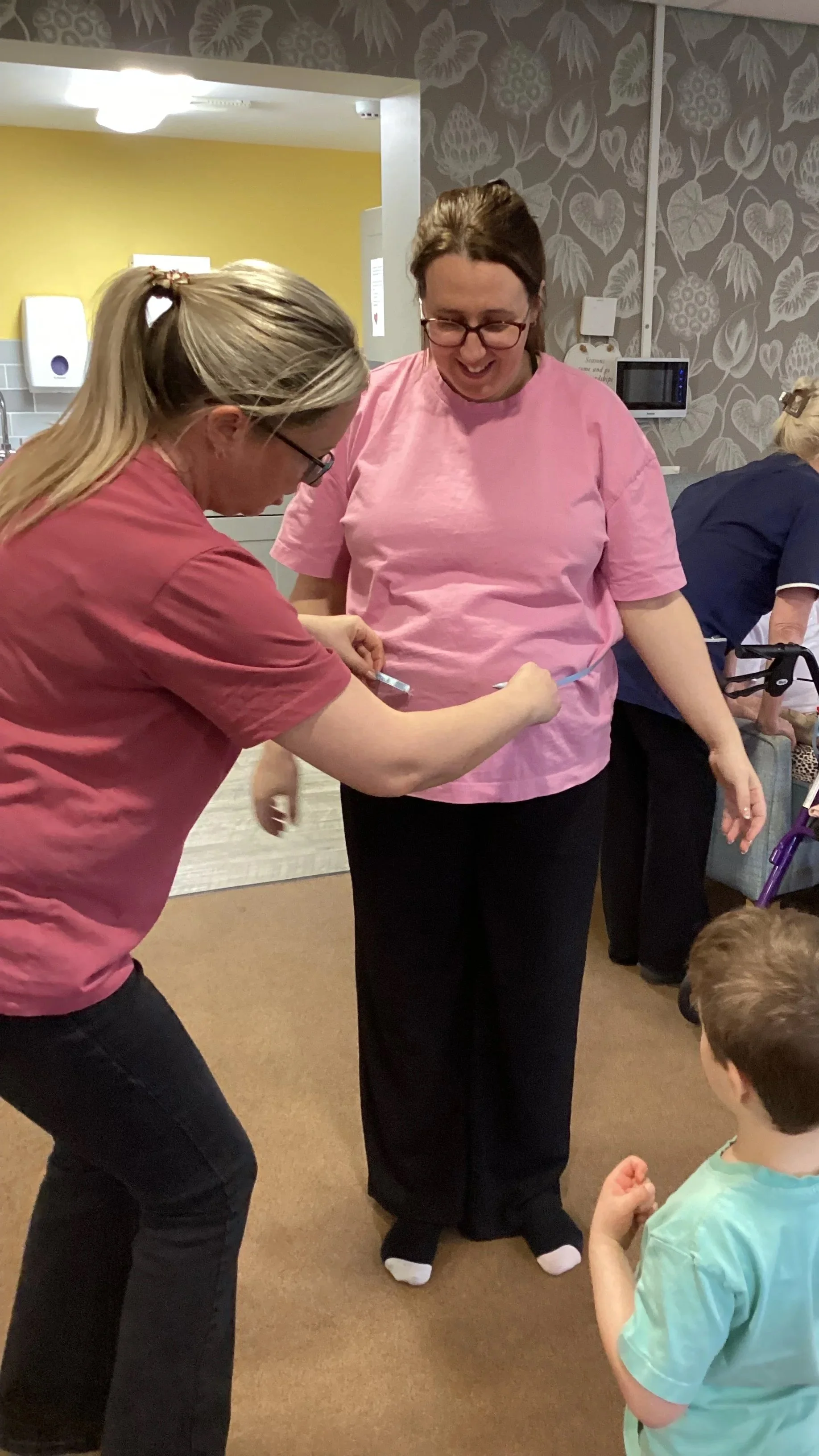 The children and their older friends carefully guessed and measured before making their cuts. We ended up with lots of different lengths, some were too small, some were too big but a few were just right! There were lots of giggles as we compared the ribbons and discovered who had guessed closest.